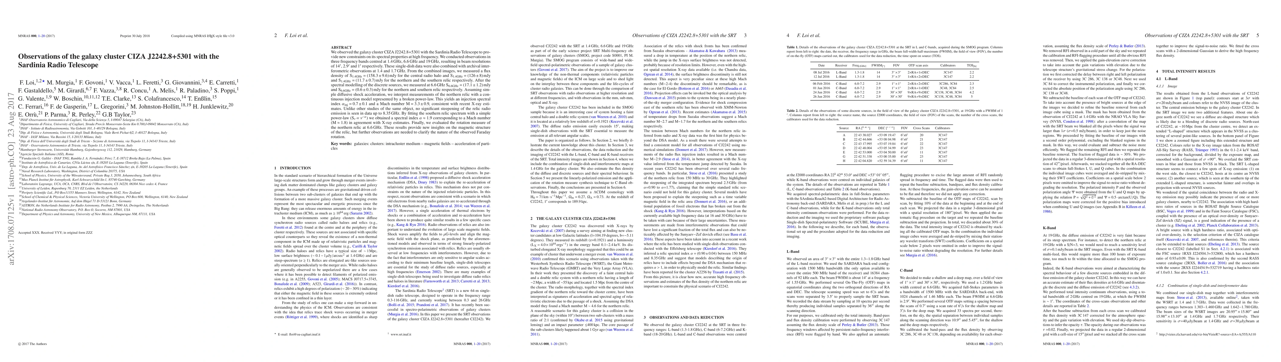 This study observed galaxy cluster CIZA J2242.8+5301 with the Sardinia Radio Telescope to constrain its spectral properties at high frequency, revealing a continuous injection model for the northern relic and a simple power-law for the southern relic.
