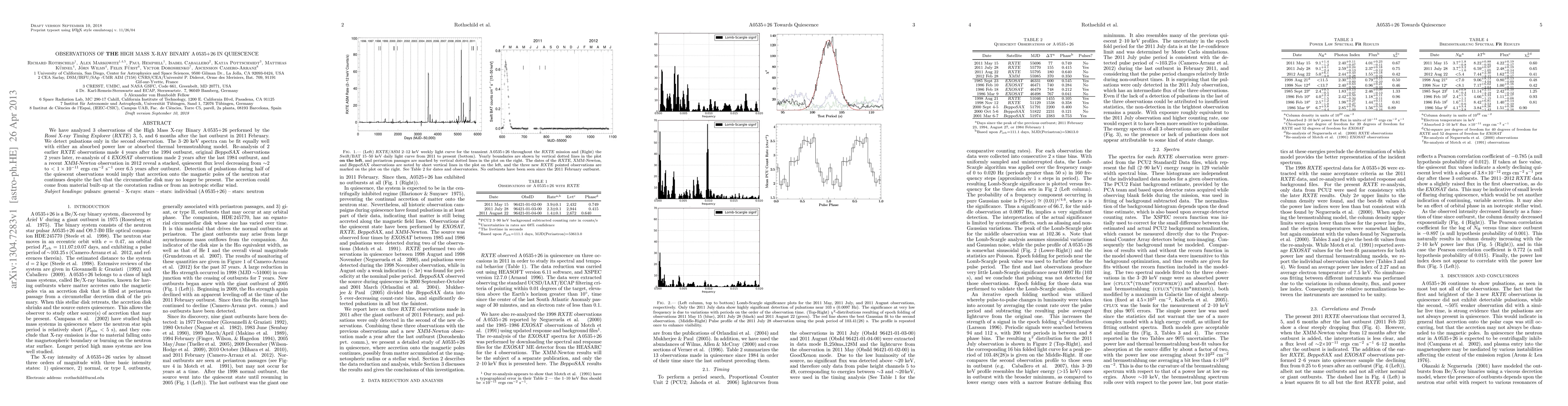 We have analyzed 3 observations of the High Mass X-ray Binary A0535+26 performed by the Rossi X-ray Timing Explorer (RXTE) 3, 5, and 6 months after the last outburst in 2011 February. We detect pulsations only in the second observation. The 3-20 keV spectra can be fit equally well with either an absorbed power law or absorbed thermal bremsstrahlung model. Re-analysis of 2 earlier RXTE observations made 4 years after the 1994 outburst, original BeppoSAX observations 2 years later, re-analysis of 4 EXOSAT observations made 2 years after the last 1984 outburst, and a recent XMM-Newton observation in 2012 reveal a stacked, quiescent flux level decreasing from ~2 to <1 x 10^{-11} ergs/cm2/s over 6.5 years after outburst. Detection of pulsations during half of the quiescent observations would imply that accretion onto the magnetic poles of the neutron star continues despite the fact that the circumstellar disk may no longer be present. The accretion could come from material built-up at the corotation radius or from an isotropic stellar wind.
