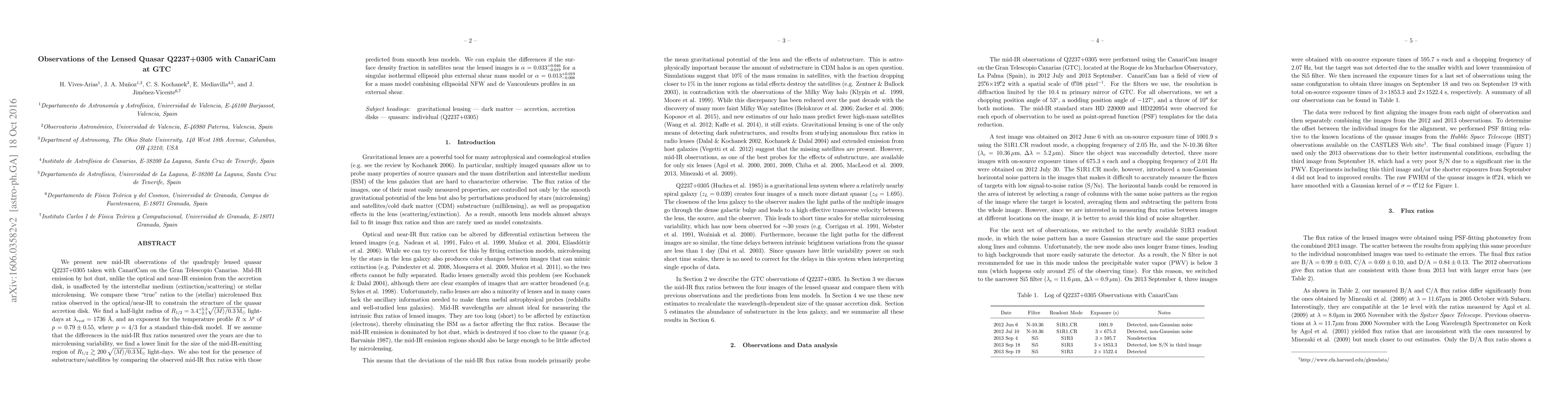 We present new mid-IR observations of the quadruply lensed quasar Q2237+0305 taken with CanariCam on the Gran Telescopio Canarias. Mid-IR emission by hot dust, unlike the optical and near-IR emission from the accretion disk, is unaffected by the interstellar medium (extinction/scattering) or stellar microlensing. We compare these "true" ratios to the (stellar) microlensed flux ratios observed in the optical/near-IR to constrain the structure of the quasar accretion disk. We find a half-light radius of $R_{1/2}=3.4_{-2.1}^{+5.3}\sqrt{\langle M \rangle/0.3\,\rm{M_{\odot}}}$ light-days at $\lambda_{rest}=1736$ {\AA}, and an exponent for the temperature profile $R \propto \lambda^{p}$ of $p=0.79\pm0.55$, where $p=4/3$ for a standard thin-disk model. If we assume that the differences in the mid-IR flux ratios measured over the years are due to microlensing variability, we find a lower limit for the size of the mid-IR-emitting region of $R_{1/2} \gtrsim 200\,\sqrt{\langle M \rangle/0.3\,\rm{M_{\odot}}}$ light-days. We also test for the presence of substructure/satellites by comparing the observed mid-IR flux ratios with those predicted from smooth lens models. We can explain the differences if the surface density fraction in satellites near the lensed images is $\alpha = 0.033_{-0.019}^{+0.046}$ for a singular isothermal ellipsoid plus external shear mass model or $\alpha = 0.013_{-0.008}^{+0.019}$ for a mass model combining ellipsoidal NFW and de Vaucouleurs profiles in an external shear.