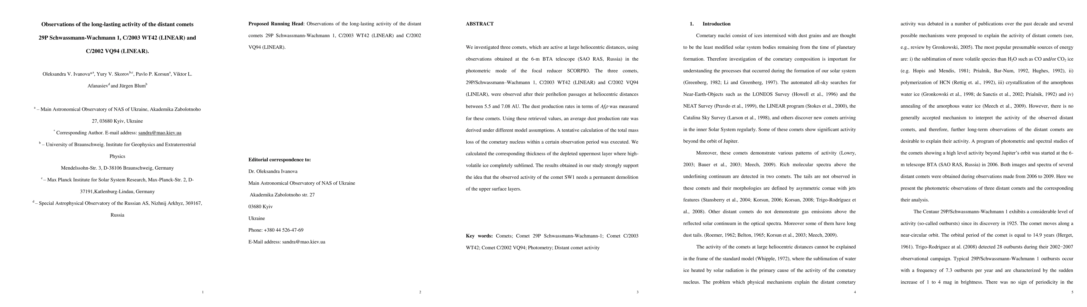 We investigated three comets, which are active at large heliocentric distances, using observations obtained at the 6-m BTA telescope (SAO RAS, Russia) in the photometric mode of the focal reducer SCORPIO. The three comets, 29P/Schwassmann-Wachmann 1, C/2003 WT42 (LINEAR), and C/2002 VQ94 (LINEAR), were observed after their perihelion passages at heliocentric distances between 5.5 and 7.08 AU. The dust production rates in terms of Afrho was measured for these comets. Using the retrieved values, an average dust production rate was derived under different model assumptions. A tentative calculation of the total mass loss of the comet nucleus within a certain observation period was executed. We calculated the corresponding thickness of the depleted uppermost layer where high-volatile ices completely sublimated. The results obtained in our study strongly support the idea that the observed activity of Comet SW1 requires a permanent demolition of the upper surface layers.