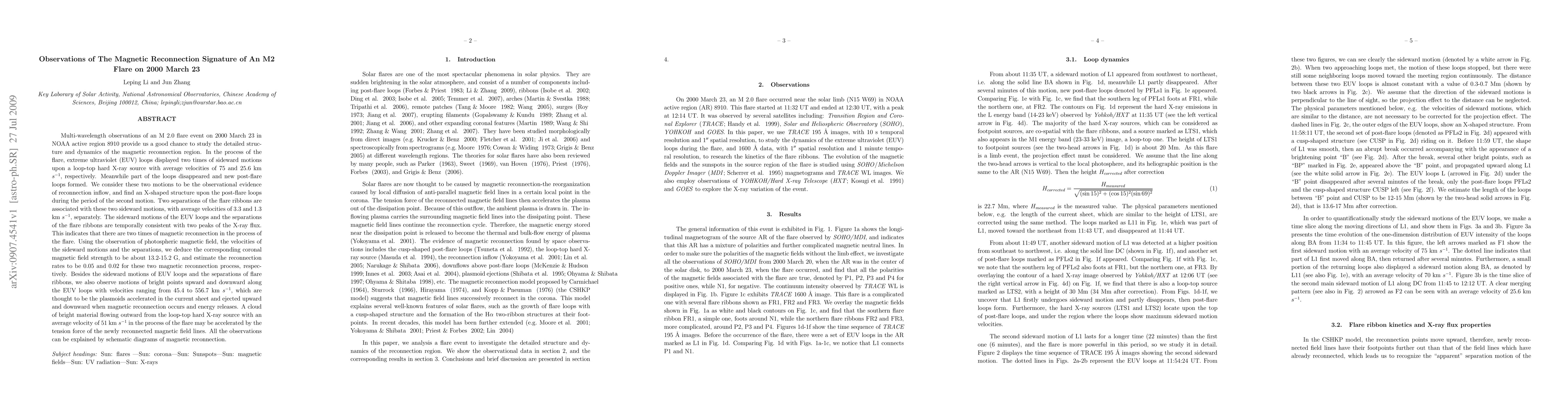 Scientists observed an M2 flare event on March 23, 2000, and found evidence of magnetic reconnection, with sideward motions indicating reconnection inflow, and estimated the reconnection rates to be around 0.05-0.02.