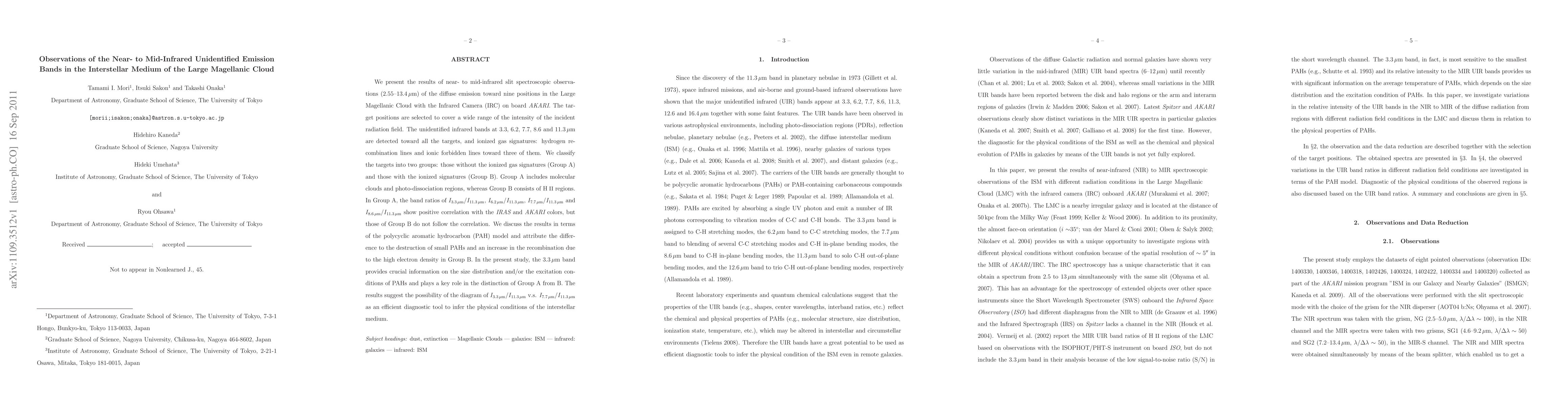 This study investigates the near- to mid-infrared emission bands in the Large Magellanic Cloud using AKARI's IRC, identifying the 3.3, 6.2, 7.7, 8.6, and 11.3 um bands, and classifies regions into those with and without ionized gas signatures, attributing differences to PAH destruction and recombination rates.