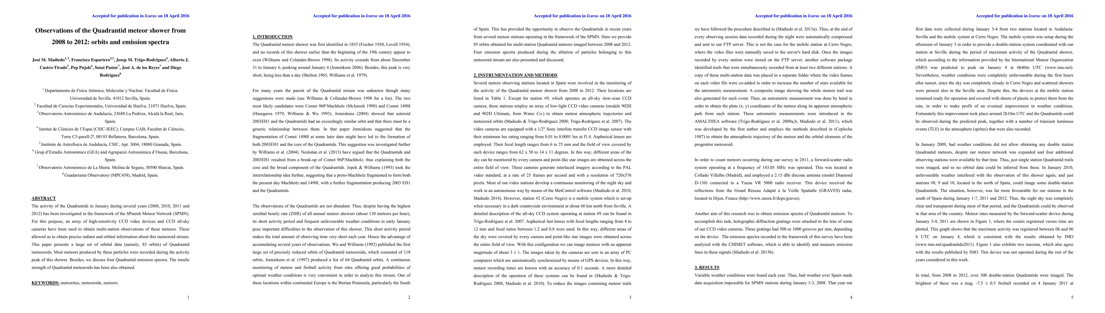 This study investigates the Quadrantid meteor shower from 2008 to 2012 using the SPanish Meteor Network, yielding precise orbital data for 85 meteoroids and analyzing their emission spectra. The research also determines the tensile strength of Quadrantid meteoroids.
