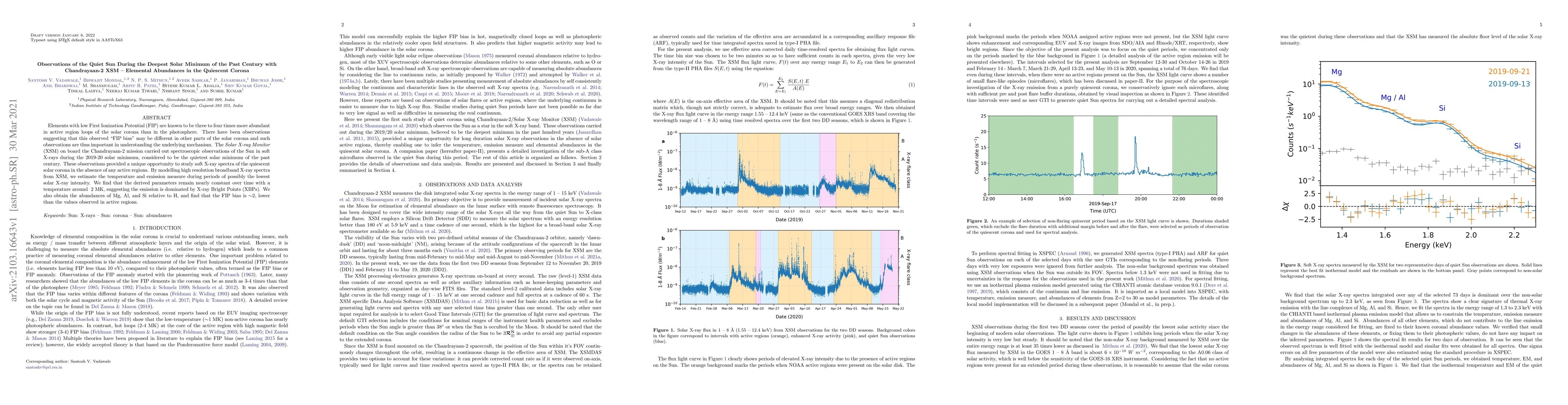 The Chandrayaan-2 XSM mission observed the quiet Sun during the 2019-20 solar minimum, finding a lower FIP bias (~2) compared to active regions, with temperatures around 2 MK dominated by XBPs. This suggests different elemental abundances in the quiescent solar corona compared to active regions.
