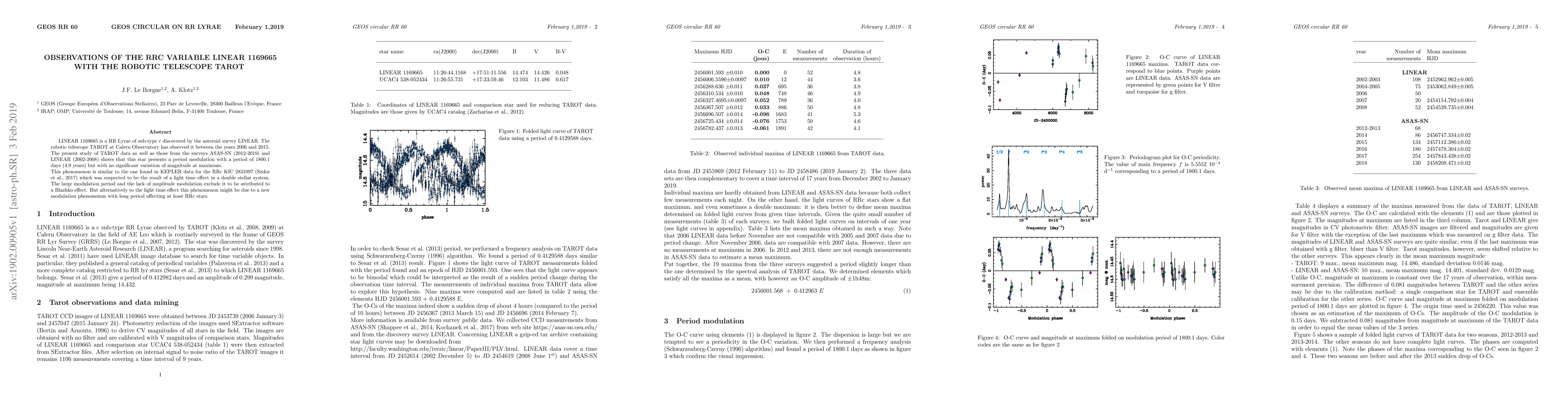 LINEAR 1169665 is a RR Lyrae of sub-type c discovered by the asteroid survey LINEAR. The robotic telescope TAROT at Calern Observatory has observed it between the years 2006 and 2015. The present study of TAROT data as well as those from the surveys ASAS-SN (2012-2019) and LINEAR (2002-2008) shows that this star presents a period modulation with a period of 1800.1 days (4.9 years) but with no significant variation of magnitude at maximum. This phenomenon is similar to the one found in KEPLER data for the RRc KIC 2831097 (Sodor et al., 2017) which was suspected to be the result of a light time effect in a double stellar system. The large modulation period and the lack of amplitude modulation exclude it to be attributed to a Blazhko effect. But alternatively to the light time effect this phenomenon might be due to a new modulation phenomenon with long period affecting at least RRc stars.