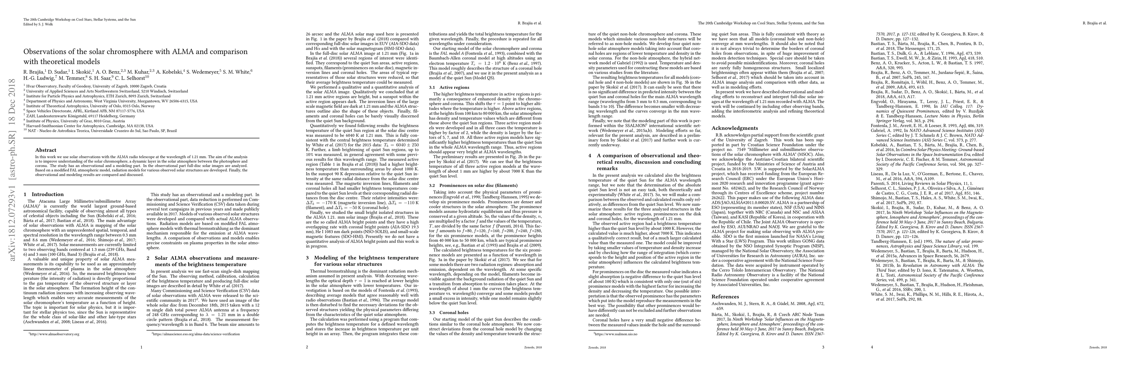 This paper uses ALMA radio telescope observations at 1.21 mm to study the solar chromosphere and compares these findings with theoretical models based on the FAL atmospheric model to enhance understanding of this dynamic solar layer. The study combines observational data analysis with the development of radiation models for various solar structures.