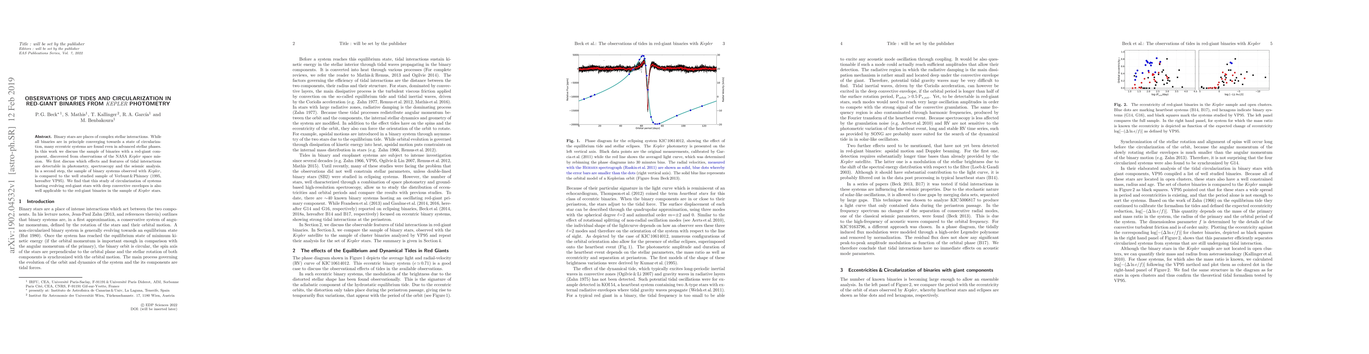 Binary stars are places of complex stellar interactions. While all binaries are in principle converging towards a state of circularization, many eccentric systems are found even in advanced stellar phases. In this work we discuss the sample of binaries with a red-giant component, discovered from observations of the NASA Kepler space mission. We first discuss which effects and features of tidal interactions are detectable in photometry, spectroscopy and the seismic analysis. In a second step, the sample of binary systems observed with Kepler, is compared to the well studied sample of Verbunt & Phinney (1995, hereafter VP95). We find that this study of circularization of systems hosting evolving red-giant stars with deep convective envelopes is also well applicable to the red-giant binaries in the sample of Kepler stars.