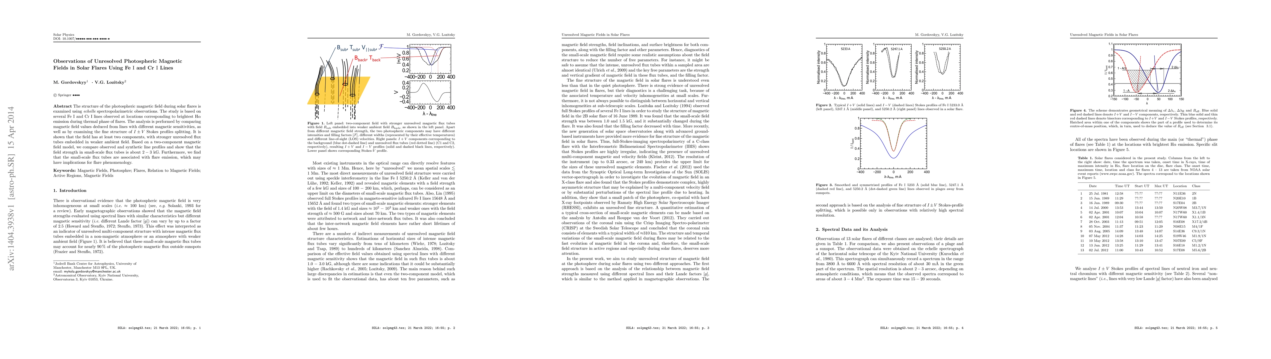 This study investigates the magnetic field structure in solar flares using Fe I and Cr I lines, revealing at least two magnetic field components. The analysis indicates that small-scale flux tubes with field strengths of about 2-3 kG are embedded in a weaker ambient field and are associated with flare emission.