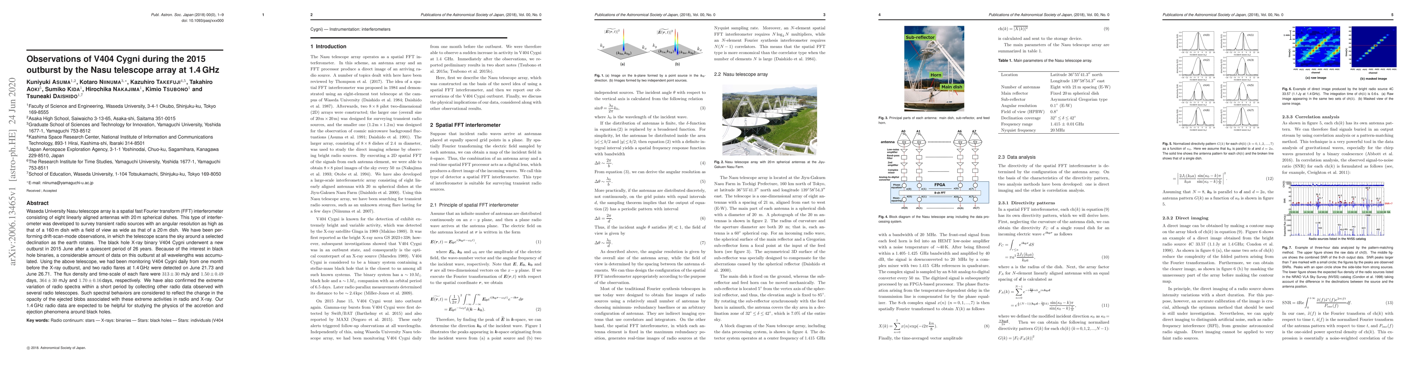 Waseda University Nasu telescope array is a spatial fast Fourier transform (FFT) interferometer consisting of eight linearly aligned antennas with 20 m spherical dishes. This type of interferometer was developed to survey transient radio sources with an angular resolution as high as that of a 160 m dish with a field of view as wide as that of a 20 m dish. We have been performing drift-scan-mode observations, in which the telescope scans the sky around a selected declination as the earth rotates. The black hole X-ray binary V404 Cygni underwent a new outburst in 2015 June after a quiescent period of 26 years. Because of the interest in black hole binaries, a considerable amount of data on this outburst at all wavelengths was accumulated. Using the above telescope, we had been monitoring V404 Cygni daily from one month before the X-ray outburst, and two radio flares at 1.4 GHz were detected on June 21.73 and June 26.71. The flux density and time-scale of each flare were 313+/-30 mJy and 1.50+/-0.49 days, 364+/-30 mJy and 1.70+/-0.16 days, respectively. We have also confirmed the extreme variation of radio spectra within a short period by collecting other radio data observed with several radio telescopes. Such spectral behaviors are considered to reflect the change in the opacity of the ejected blobs associated with these extreme activities in radio and X-ray. Our 1.4 GHz radio data are expected to be helpful for studying the physics of the accretion and ejection phenomena around black holes.