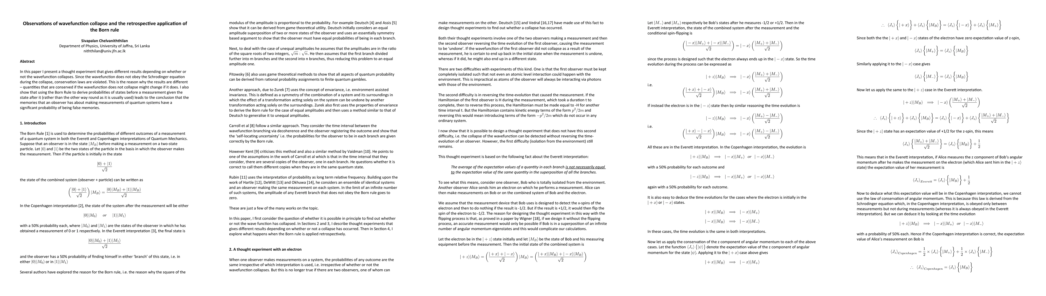 This paper explores a thought experiment illustrating discrepancies in outcomes when wavefunction collapse is considered versus when it is not, highlighting conservation law violations during collapse. It also demonstrates that applying the Born Rule retrospectively suggests that observers' memories of quantum measurements may often be incorrect.