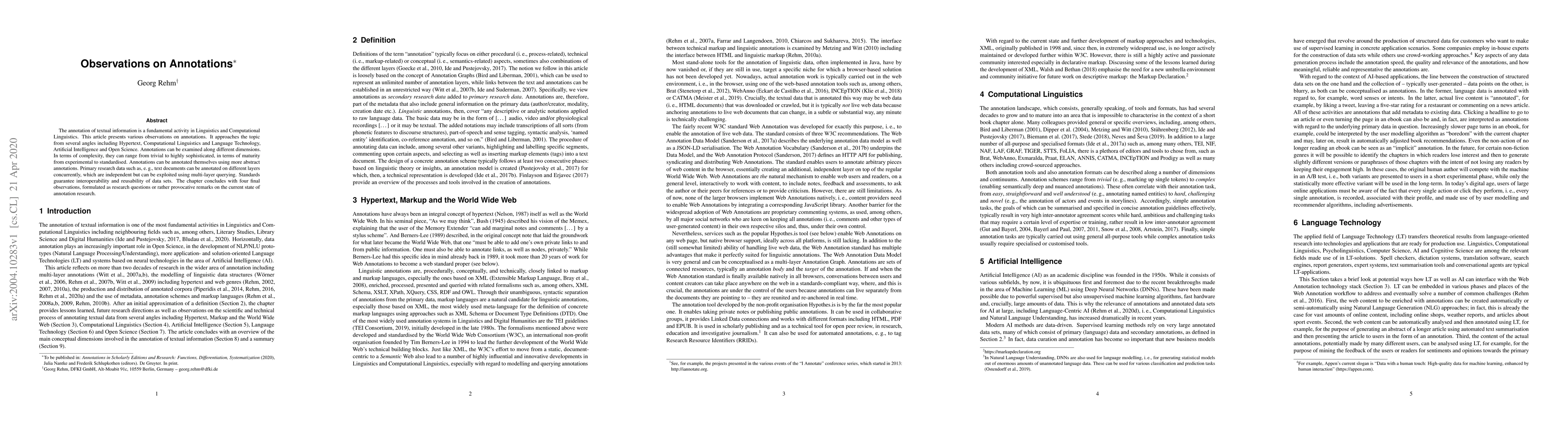The annotation of textual information is a fundamental activity in Linguistics and Computational Linguistics. This article presents various observations on annotations. It approaches the topic from several angles including Hypertext, Computational Linguistics and Language Technology, Artificial Intelligence and Open Science. Annotations can be examined along different dimensions. In terms of complexity, they can range from trivial to highly sophisticated, in terms of maturity from experimental to standardised. Annotations can be annotated themselves using more abstract annotations. Primary research data such as, e.g., text documents can be annotated on different layers concurrently, which are independent but can be exploited using multi-layer querying. Standards guarantee interoperability and reusability of data sets. The chapter concludes with four final observations, formulated as research questions or rather provocative remarks on the current state of annotation research.