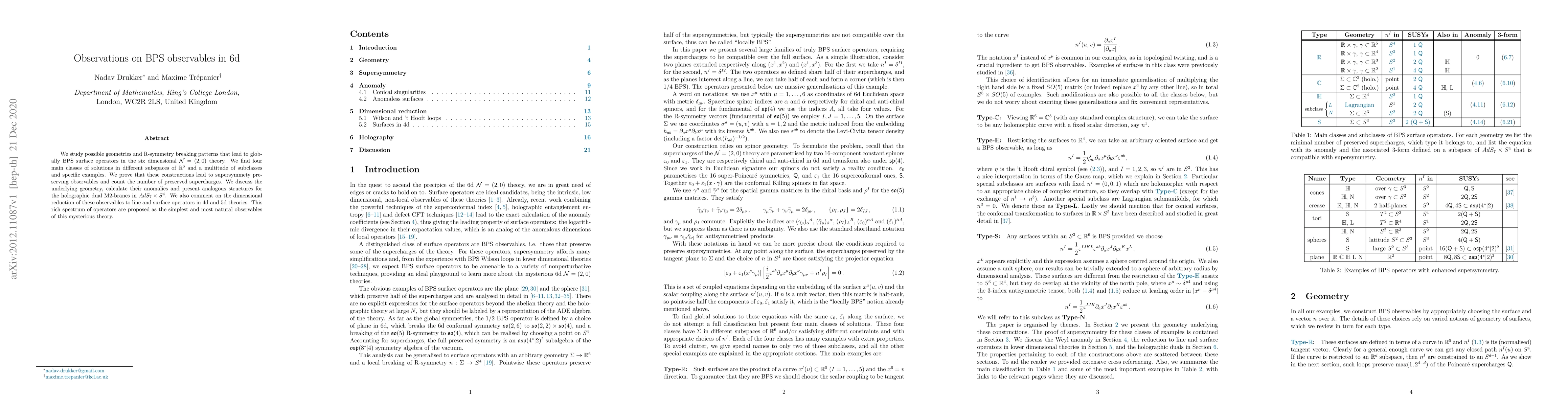 We study possible geometries and R-symmetry breaking patterns that lead to globally BPS surface operators in the six dimensional $\mathcal{N}=(2,0)$ theory. We find four main classes of solutions in different subspaces of $\mathbb{R}^6$ and a multitude of subclasses and specific examples. We prove that these constructions lead to supersymmety preserving observables and count the number of preserved supercharges. We discuss the underlying geometry, calculate their anomalies and present analogous structures for the holographic dual M2-branes in $AdS_7\times S^4$. We also comment on the dimensional reduction of these observables to line and surface operators in 4d and 5d theories. This rich spectrum of operators are proposed as the simplest and most natural observables of this mysterious theory.