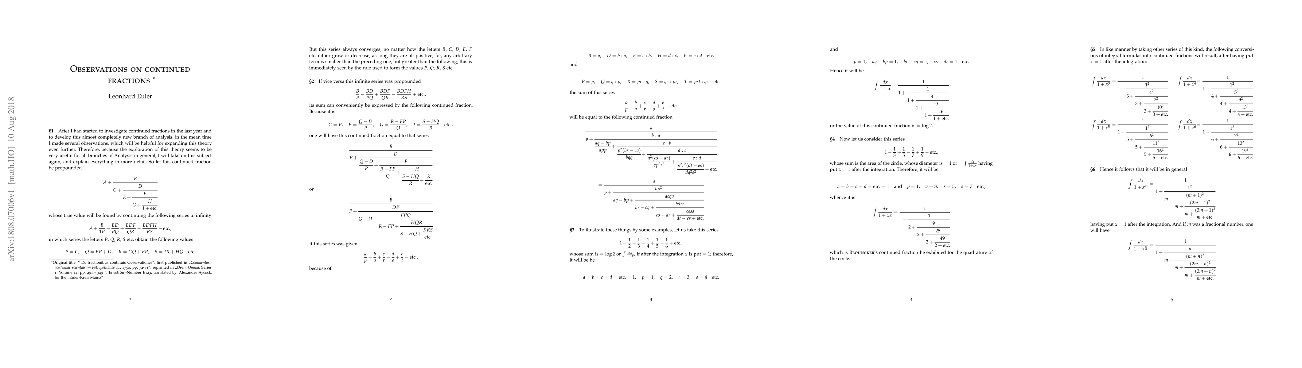 Euler's translation elucidates his theory on continued fractions, detailing methods to convert series into continued fractions and solving the Riccati-Differential equation using this approach, alongside discovering notable formulas such as the continued fraction for hypergeometric series.