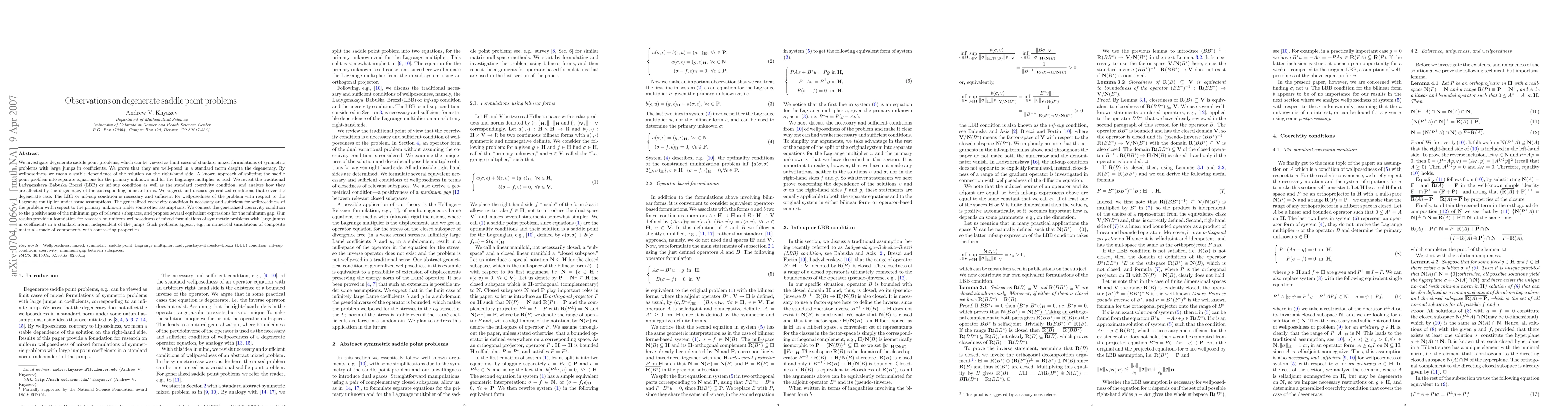 Researchers investigate degenerate saddle point problems, proving they are well-posed in a standard norm despite degeneracy, and propose new conditions for stability and uniform well-posedness of mixed formulations.