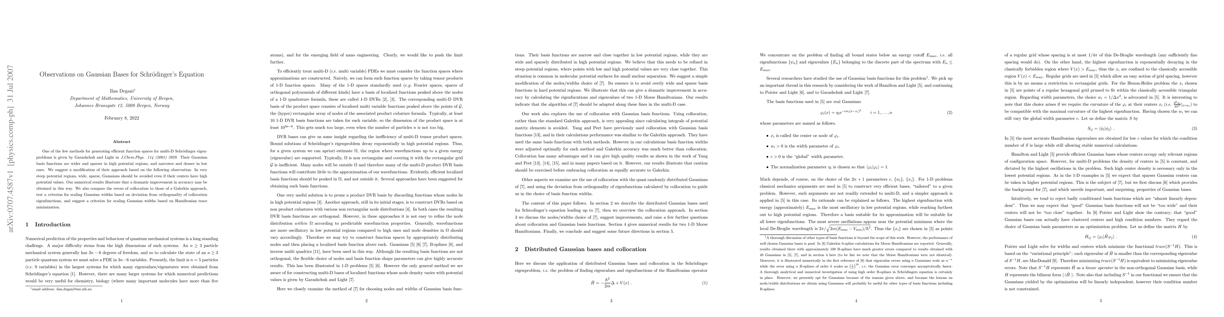 One of the few methods for generating efficient function spaces for multi-D Schrodinger eigenproblems is given by Garashchuk and Light in J.Chem.Phys. 114 (2001) 3929. Their Gaussian basis functions are wider and sparser in high potential regions, and narrower and denser in low ones. We suggest a modification of their approach based on the following observation: In very steep potential regions, wide, sparse, Gaussians should be avoided even if their centers have high potential values. Our numerical results illustrate that a dramatic improvement in accuracy may be obtained in this way. We also compare the errors of collocation to those of a Galerkin approach, test a criterion for scaling Gaussian widths based on deviation from orthogonality of collocation eigenfunctions, and suggest a criterion for scaling Gaussian widths based on Hamiltonian trace minimization.