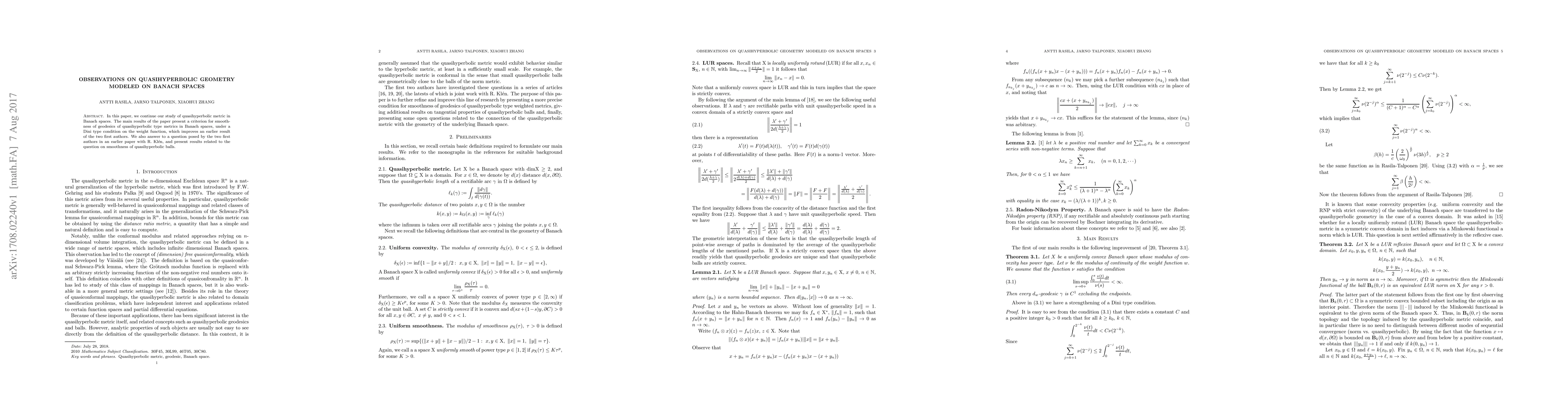 In this paper, we continue our study of quasihyperbolic metric in Banach spaces. The main results of the paper present a criterion for smoothness of geodesics of quasihyperbolic type metrics in Banach spaces, under a Dini type condition on the weight function, which improves an earlier result of the two first authors. We also answer to a question posed by the two first authors in an earlier paper with R. Kl\'en, and present results related to the question on smoothness of quasihyperbolic balls.