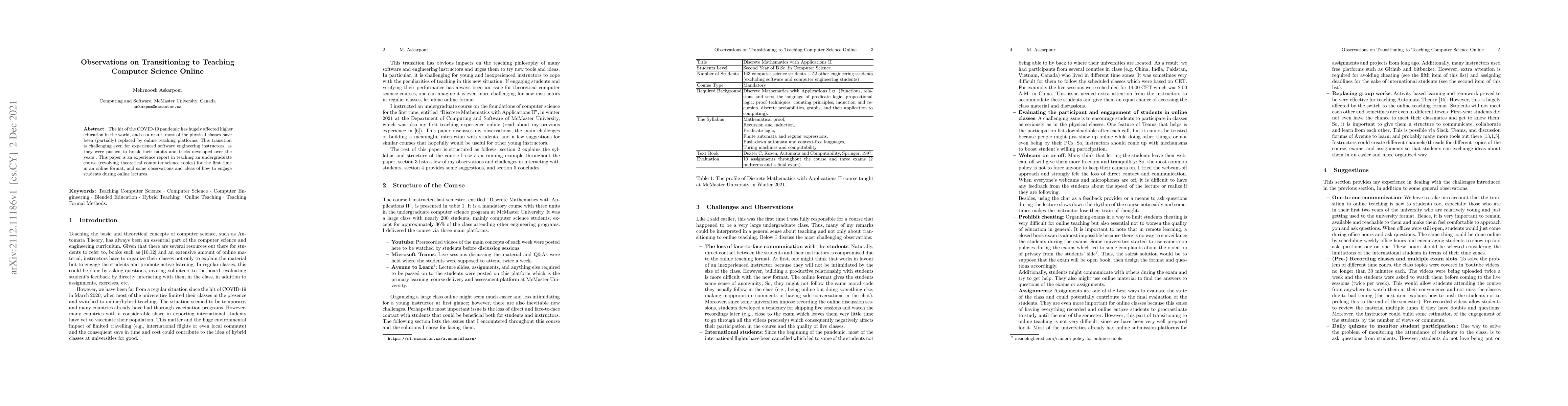 The hit of the COVID-19 pandemic has hugely affected higher education in the world, and as a result, most of the physical classes have been (partially) replaced by online teaching platforms. This transition is challenging even for experienced software engineering instructors, as they were pushed to break their habits and tricks developed over the years. This paper is an experience report in teaching an undergraduate course (revolving theoretical computer science topics) for the first time in an online format, and some observations and ideas of how to engage students during online lectures.