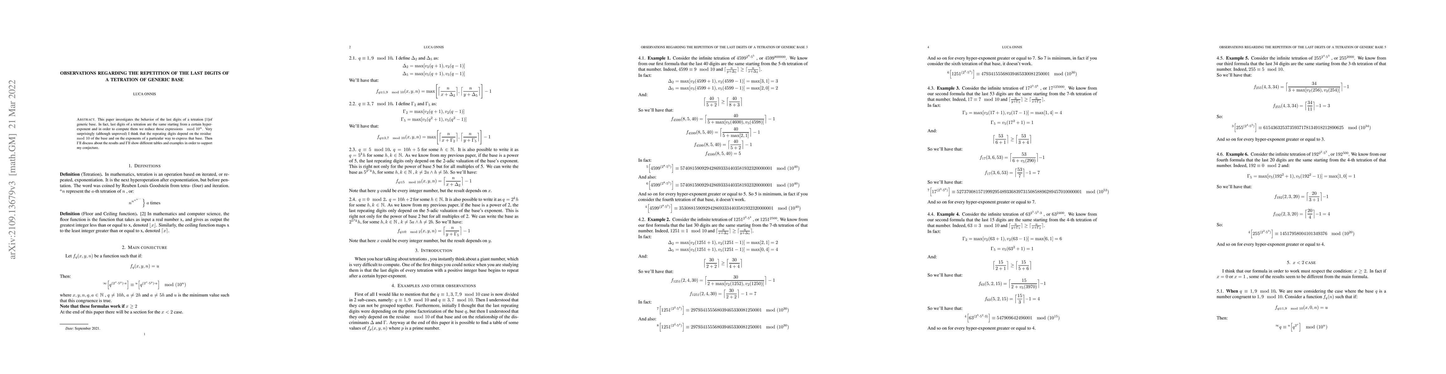 Researchers investigate how the last digits of a tetration (a mathematical operation) repeat based on the base and exponents, proposing a formula to find when they become repetitive.