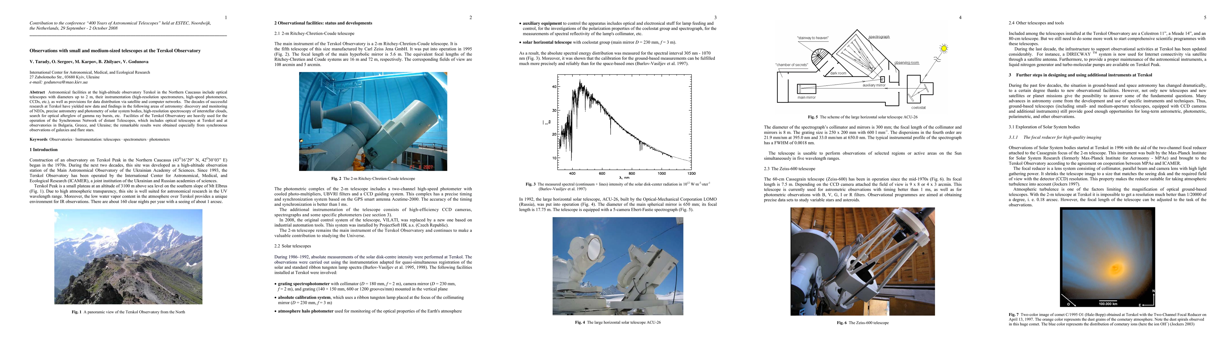 The Terskol Observatory in the Northern Caucasus, equipped with telescopes up to 2m in diameter and advanced instrumentation, has contributed significantly to astronomy. Notable findings include new Near-Earth Object discoveries, precise measurements of solar system bodies, high-resolution spectroscopy of interstellar clouds, and searches for optical afterglows of gamma-ray bursts. The observatory also plays a crucial role in the Synchronous Network of distant Telescopes, facilitating synchronous observations of galaxies and flare stars yielding remarkable results.