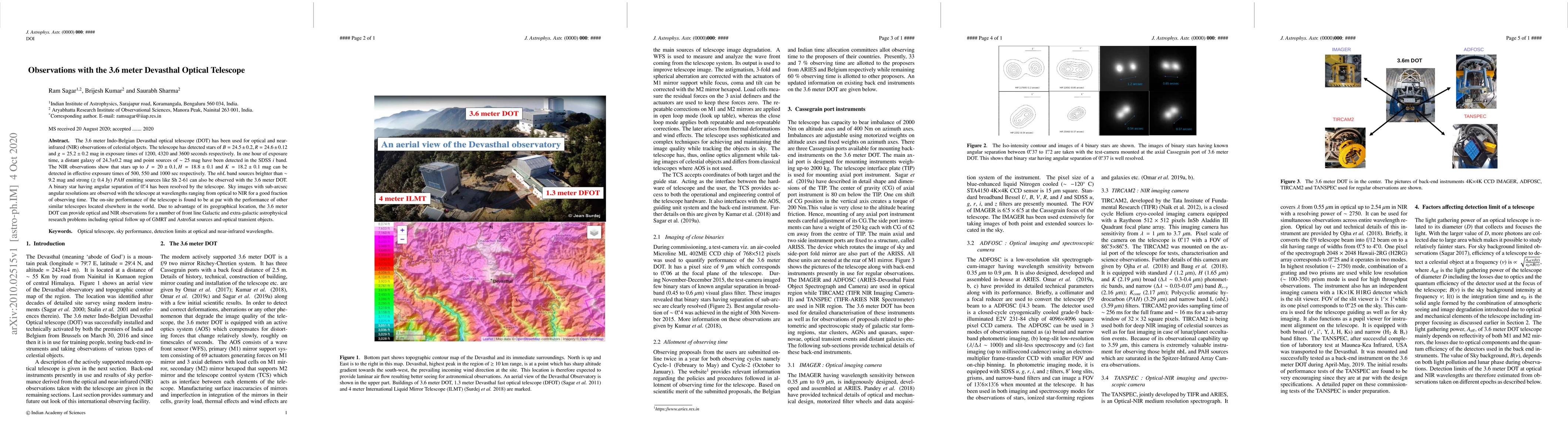 The 3.6 meter Indo-Belgian Devasthal Optical Telescope has successfully detected distant galaxies, stars, and point sources in various wavelengths, with capabilities for resolving binary stars and observing strong PAH emitting sources.