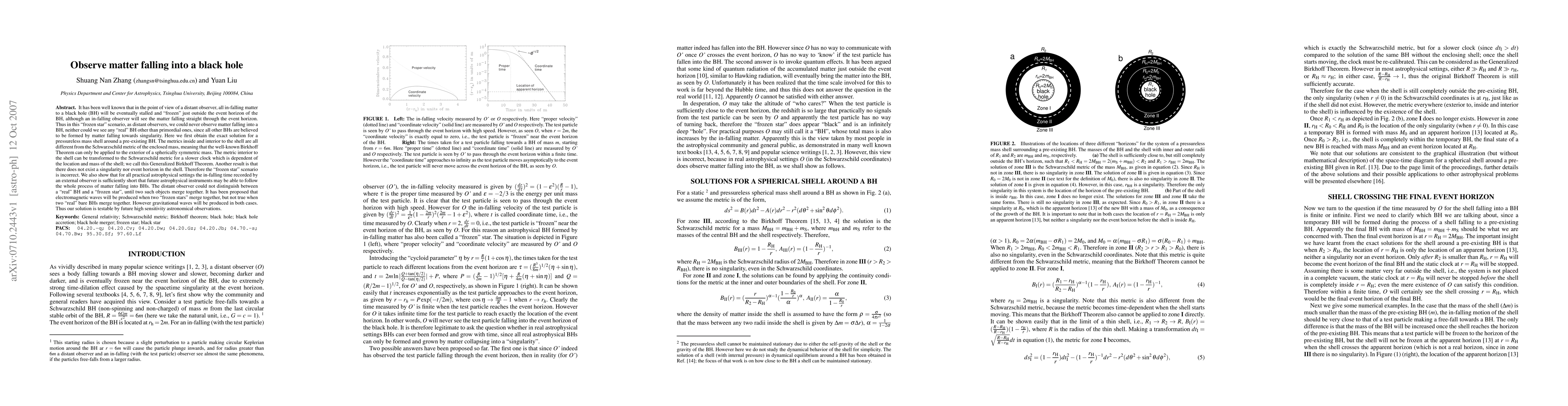 It has been well known that in the point of view of a distant observer, all in-falling matter to a black hole (BH) will be eventually stalled and "frozen" just outside the event horizon of the BH, although an in-falling observer will see the matter falling straight through the event horizon. Thus in this "frozen star" scenario, as distant observers, we could never observe matter falling into a BH, neither could we see any "real" BH other than primordial ones, since all other BHs are believed to be formed by matter falling towards singularity. Here we first obtain the exact solution for a pressureless mass shell around a pre-existing BH. The metrics inside and interior to the shell are all different from the Schwarzschild metric of the enclosed mass. The metric interior to the shell can be transformed to the Schwarzschild metric for a slower clock which is dependent of the location and mass of the shell. Another result is that there does not exist a singularity nor event horizon in the shell. Therefore the "frozen star" scenario is incorrect. We also show that for all practical astrophysical settings the in-falling time recorded by an external observer is sufficiently short that future astrophysical instruments may be able to follow the whole process of matter falling into BHs. The distant observer could not distinguish between a "real" BH and a "frozen star", until two such objects merge together. It has been proposed that electromagnetic waves will be produced when two "frozen stars" merge together, but not true when two "real" bare BHs merge together. However gravitational waves will be produced in both cases. Thus our solution is testable by future high sensitivity astronomical observations.