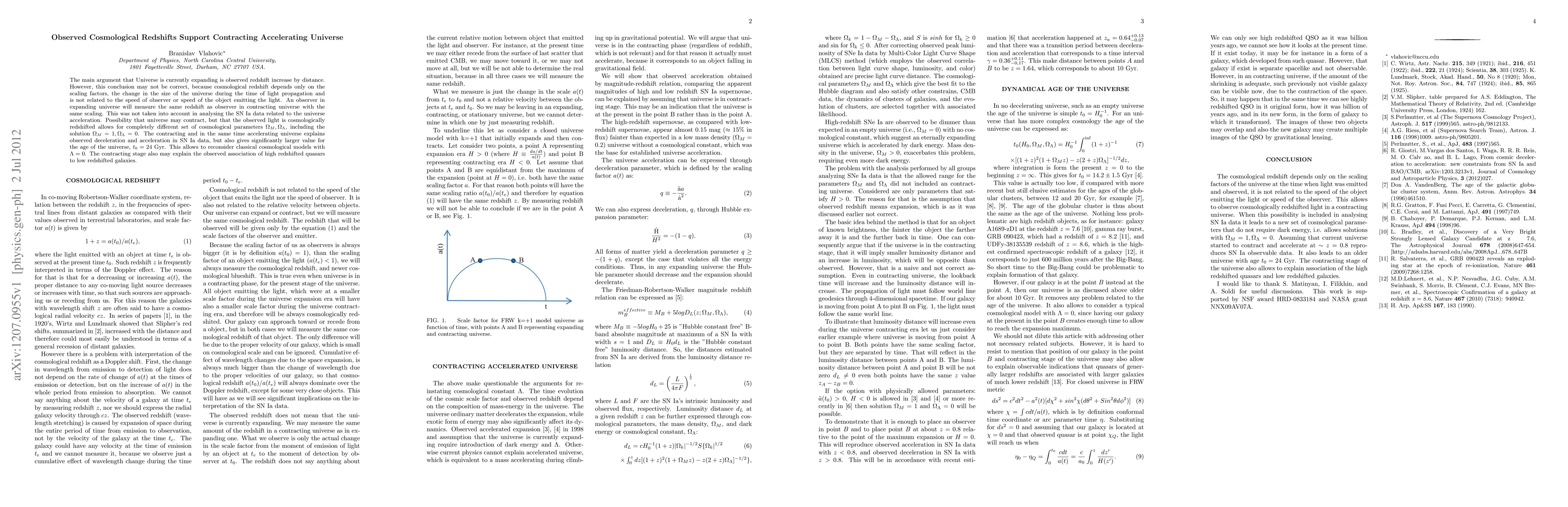 The main argument that Universe is currently expanding is observed redshift increase by distance. However, this conclusion may not be correct, because cosmological redshift depends only on the scaling factors, the change in the size of the universe during the time of light propagation and is not related to the speed of observer or speed of the object emitting the light. An observer in expanding universe will measure the same redshift as observer in contracting universe with the same scaling. This was not taken into account in analysing the SN Ia data related to the universe acceleration. Possibility that universe may contract, but that the observed light is cosmologically redshifted allows for completely different set of cosmological parameters $\Omega_M, \Omega_{\Lambda}$, including the solution $\Omega_M=1, \Omega_{\Lambda}=0$. The contracting and in the same time accelerating universe explains observed deceleration and acceleration in SN Ia data, but also gives significantly larger value for the age of the universe, $t_0 = 24$ Gyr. This allows to reconsider classical cosmological models with $\Lambda =0$. The contracting stage also may explain the observed association of high redshifted quasars to low redshifted galaxies.