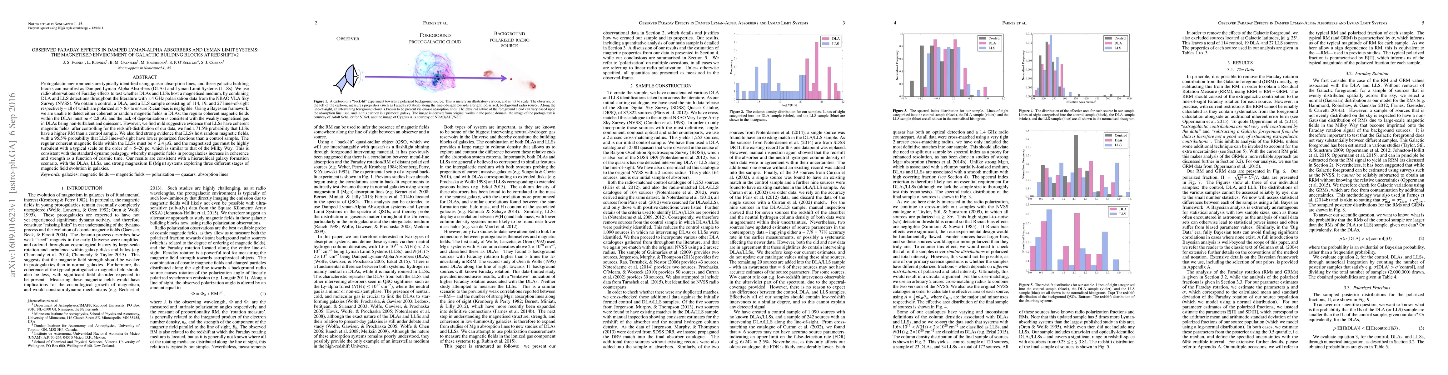 Protogalactic environments are typically identified using quasar absorption lines, and these galactic building blocks can manifest as Damped Lyman-Alpha Absorbers (DLAs) and Lyman Limit Systems (LLSs). We use radio observations of Faraday effects to test whether DLAs and LLSs host a magnetised medium, by combining DLA and LLS detections throughout the literature with 1.4 GHz polarization data from the NRAO VLA Sky Survey (NVSS). We obtain a control, a DLA, and a LLS sample consisting of 114, 19, and 27 lines-of-sight respectively - all of which are polarized at $\ge8\sigma$ to ensure Rician bias is negligible. Using a Bayesian framework, we are unable to detect either coherent or random magnetic fields in DLAs: the regular coherent magnetic fields within the DLAs must be $\le2.8$ $\mu$G, and the lack of depolarization is consistent with the weakly magnetised gas in DLAs being non-turbulent and quiescent. However, we find mild suggestive evidence that LLSs have coherent magnetic fields: after controlling for the redshift-distribution of our data, we find a 71.5% probability that LLSs have a higher RM than a control sample. We also find strong evidence that LLSs host random magnetic fields, with a 95.5% probability that LLS lines-of-sight have lower polarized fractions than a control sample. The regular coherent magnetic fields within the LLSs must be $\le2.4$ $\mu$G, and the magnetised gas must be highly turbulent with a typical scale on the order of $\approx5$-20 pc, which is similar to that of the Milky Way. This is consistent with the standard dynamo pedagogy, whereby magnetic fields in protogalaxies increase in coherence and strength as a function of cosmic time. Our results are consistent with a hierarchical galaxy formation scenario, with the DLAs, LLSs, and strong magnesium II (MgII) systems exploring three different stages of magnetic field evolution in galaxies.