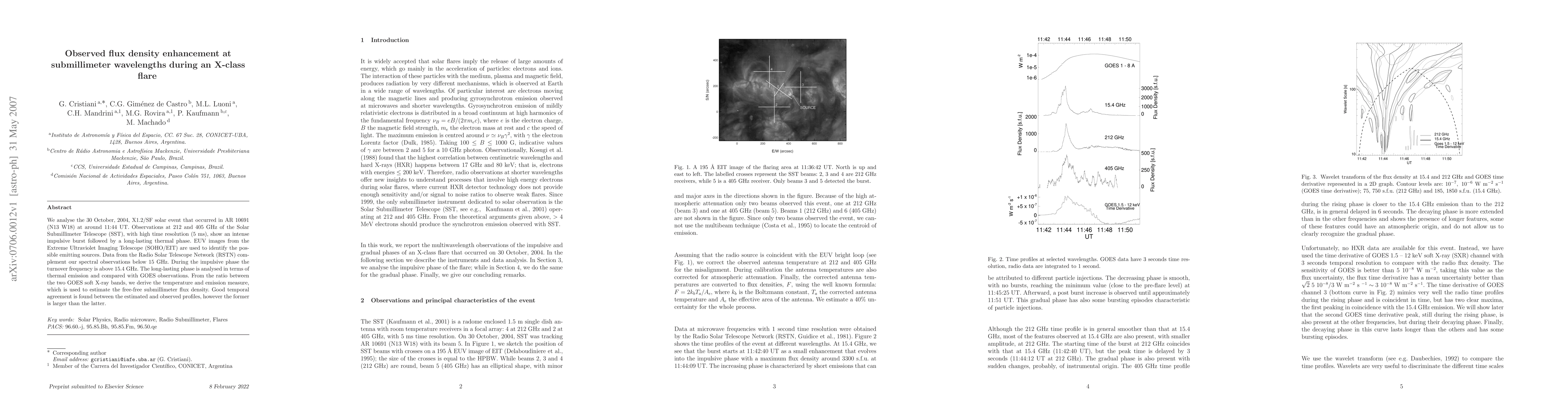 We analyse the 30 October, 2004, X1.2/SF solar event that occurred in AR 10691 (N13 W18) at around 11:44 UT. Observations at 212 and 405 GHz of the Solar Submillimeter Telescope (SST), with high time resolution (5 ms), show an intense impulsive burst followed by a long-lasting thermal phase. EUV images from the Extreme Ultraviolet Imaging Telescope (SOHO/EIT) are used to identify the possible emitting sources. Data from the Radio Solar Telescope Network (RSTN) complement our spectral observations below 15 GHz. During the impulsive phase the turnover frequency is above 15.4 GHz. The long-lasting phase is analysed in terms of thermal emission and compared with GOES observations. From the ratio between the two GOES soft X-ray bands, we derive the temperature and emission measure, which is used to estimate the free-free submillimeter flux density. Good temporal agreement is found between the estimated and observed profiles, however the former is larger than the latter.