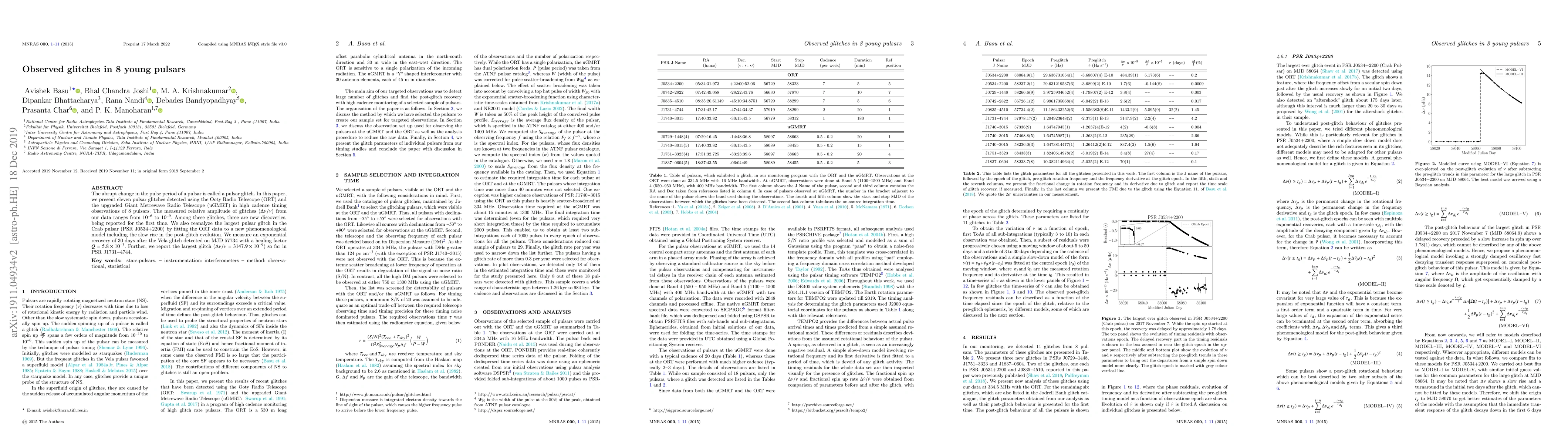 This paper reports eleven pulsar glitches detected in eight young pulsars using the Ooty Radio Telescope and the upgraded Giant Metrewave Radio Telescope, including three new discoveries. The study also reanalyzes the Crab pulsar's largest glitch and measures an exponential recovery period of 30 days for the Vela glitch.