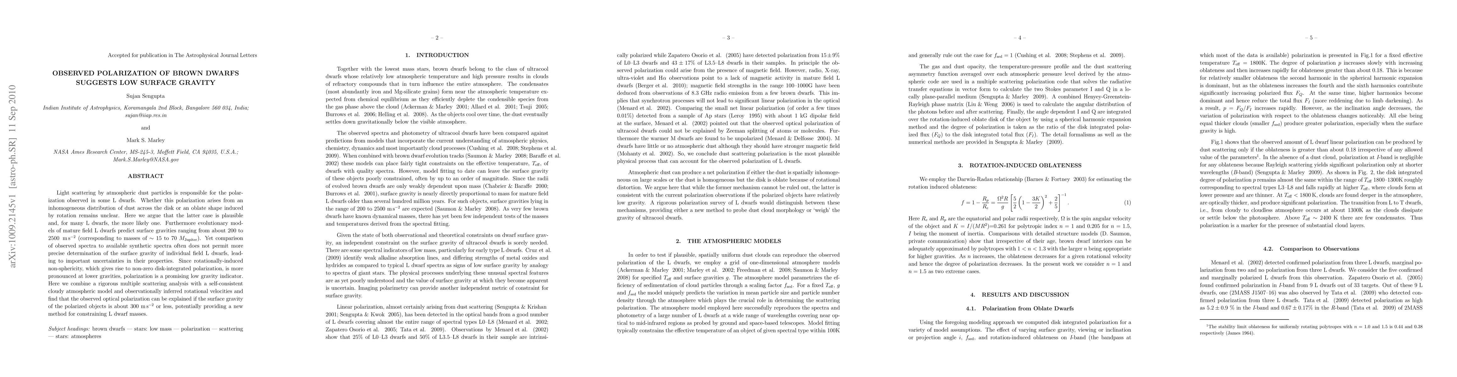Light scattering by atmospheric dust particles is responsible for the polarization observed in some L dwarfs. Whether this polarization arises from an inhomogeneous distribution of dust across the disk or an oblate shape induced by rotation remains unclear. Here we argue that the latter case is plausible and, for many L dwarfs, the more likely one. Furthermore evolutionary models of mature field L dwarfs predict surface gravities ranging from about 200 to 2500 m/s^2 (corresponding to masses of about 15 to 70 times of Jupiter mass). Yet comparison of observed spectra to available synthetic spectra often does not permit more precise determination of the surface gravity of individual field L dwarfs, leading to important uncertainties in their properties. Since rotationally-induced non-sphericity, which gives rise to non-zero disk-integrated polarization, is more pronounced at lower gravities, polarization is a promising low gravity indicator. Here we combine a rigorous multiple scattering analysis with a self-consistent cloudy atmospheric model and observationally inferred rotational velocities and find that the observed optical polarization can be explained if the surface gravity of the polarized objects is about 300 m/s^2 or less, potentially providing a new method for constraining L dwarf masses.