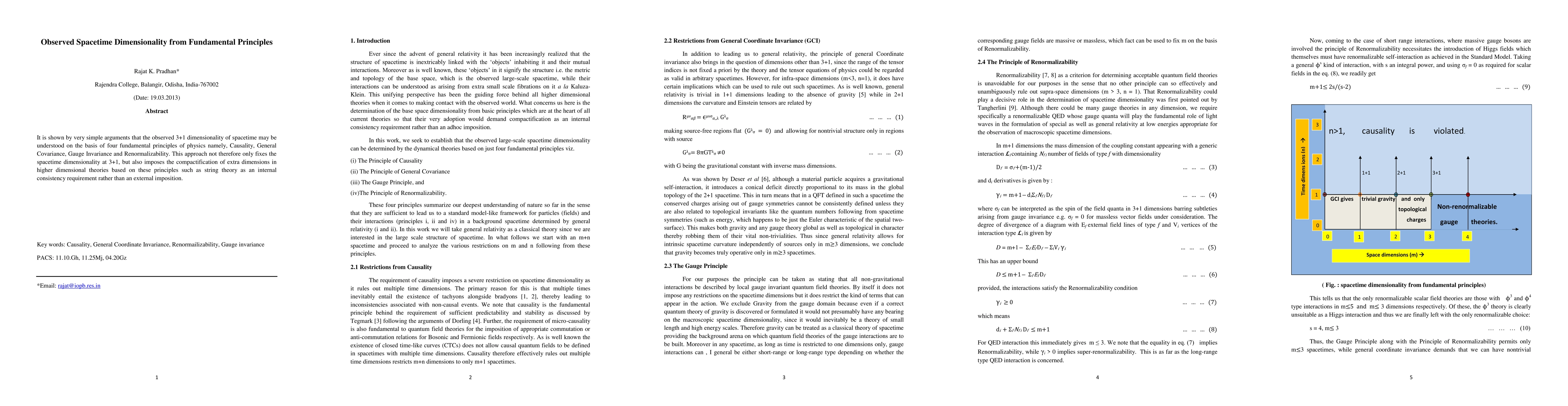 This paper presents a simple argument demonstrating that the 3+1 spacetime dimensionality is derived from fundamental physics principles: Causality, General Covariance, Gauge Invariance, and Renormalizability. It also implies compactification of extra dimensions in higher-dimensional theories like string theory as an internal consistency requirement.