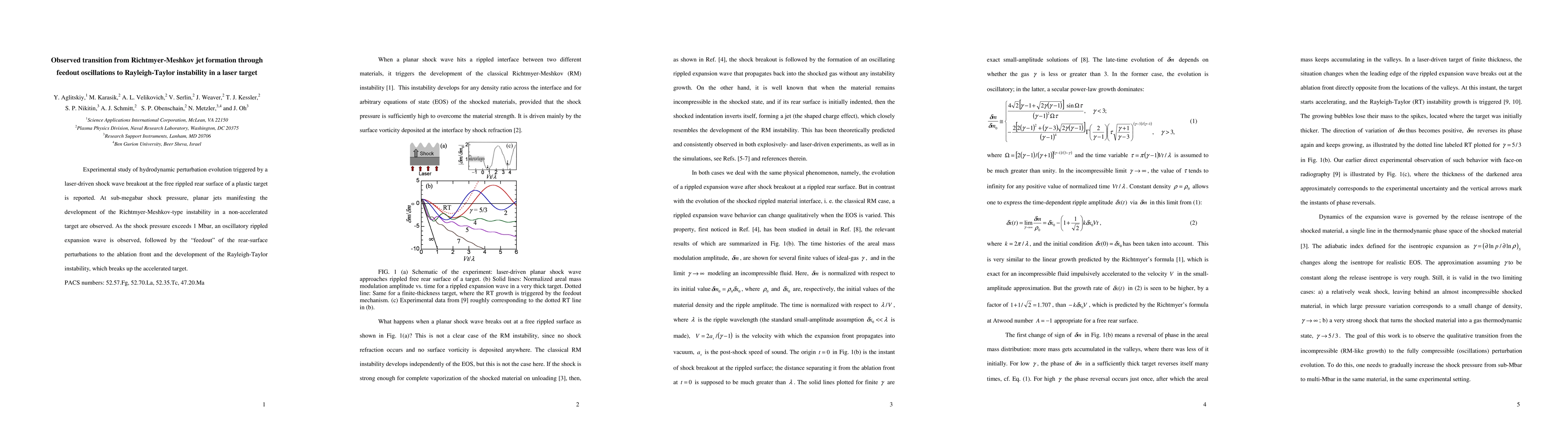 This study observes the transition from Richtmyer-Meshkov jet formation to Rayleigh-Taylor instability in a laser-driven shock wave experiment. As shock pressure surpasses 1 Mbar, rear-surface perturbations "feedout" and trigger the Rayleigh-Taylor instability, disrupting the accelerated target.