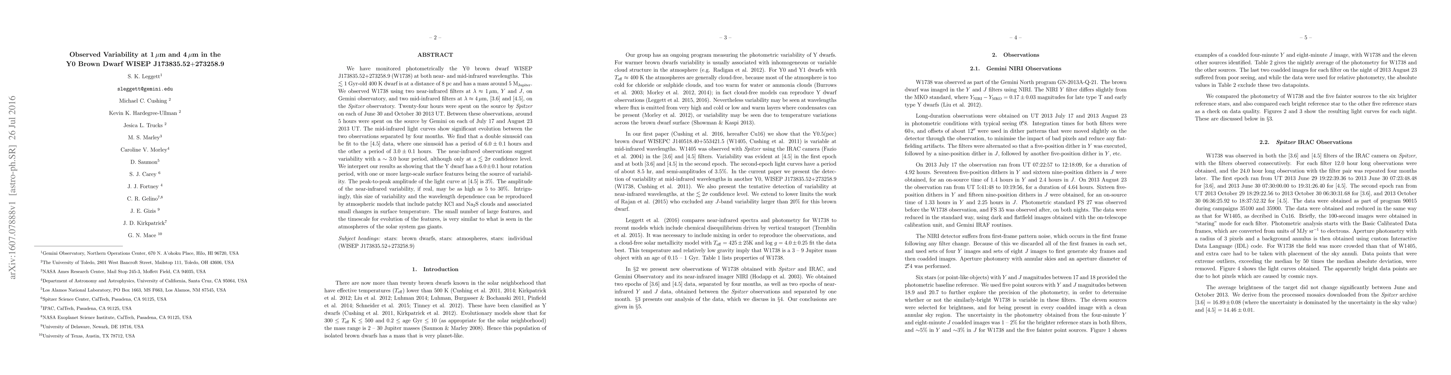 We have monitored photometrically the Y0 brown dwarf WISEP J173835.52+273258.9 (W1738) at both near- and mid-infrared wavelengths. This ~1 Gyr-old 400K dwarf is at a distance of 8pc and has a mass around 5 M_Jupiter. We observed W1738 using two near-infrared filters at lambda~1um, Y and J, on Gemini observatory, and two mid-infrared filters at lambda~4um, [3.6] and [4.5], on the Spitzer observatory. Twenty-four hours were spent on the source by Spitzer on each of June 30 and October 30 2013 UT. Between these observations, around 5 hours were spent on the source by Gemini on each of July 17 and August 23 2013 UT. The mid-infrared light curves show significant evolution between the two observations separated by four months. We find that a double sinusoid can be fit to the [4.5] data, where one sinusoid has a period of 6.0 +/- 0.1 hours and the other a period of 3.0 +/- 0.1 hours. The near-infrared observations suggest variability with a ~3.0 hour period, although only at a <~2 sigma confidence level. We interpret our results as showing that the Y dwarf has a 6.0 +/- 0.1 hour rotation period, with one or more large-scale surface features being the source of variability. The peak-to-peak amplitude of the light curve at [4.5] is 3%. The amplitude of the near-infrared variability, if real, may be as high as 5 to 30%. Intriguingly, this size of variability and the wavelength dependence can be reproduced by atmospheric models that include patchy KCl and Na_2S clouds and associated small changes in surface temperature. The small number of large features, and the timescale for evolution of the features, is very similar to what is seen in the atmospheres of the solar system gas giants.