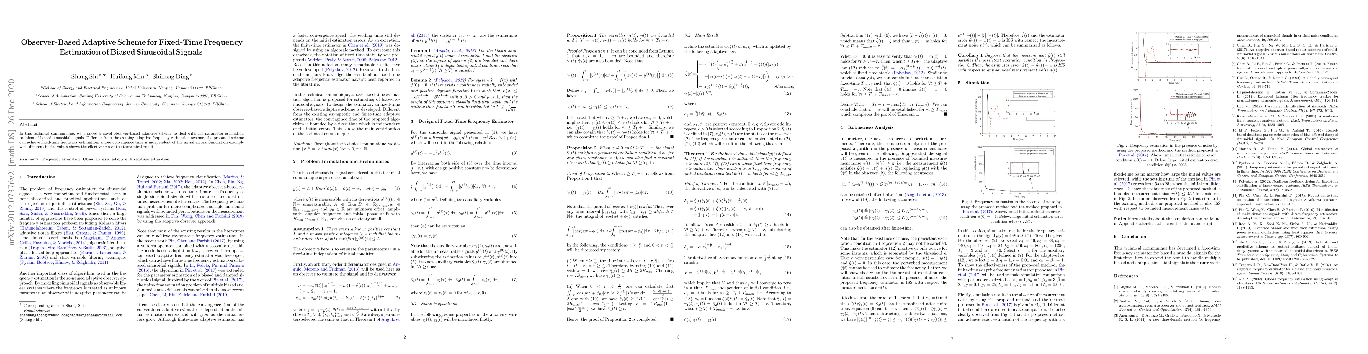In this technical communique, we propose a novel observer-based adaptive scheme to deal with the parameter estimation problem of biased sinusoidal signals. Different from the existing adaptive frequency estimation scheme, the proposed scheme can achieve fixed-time frequency estimation, whose convergence time is independent of the initial errors. Simulation example with different initial values shows the effectiveness of the theoretical result.