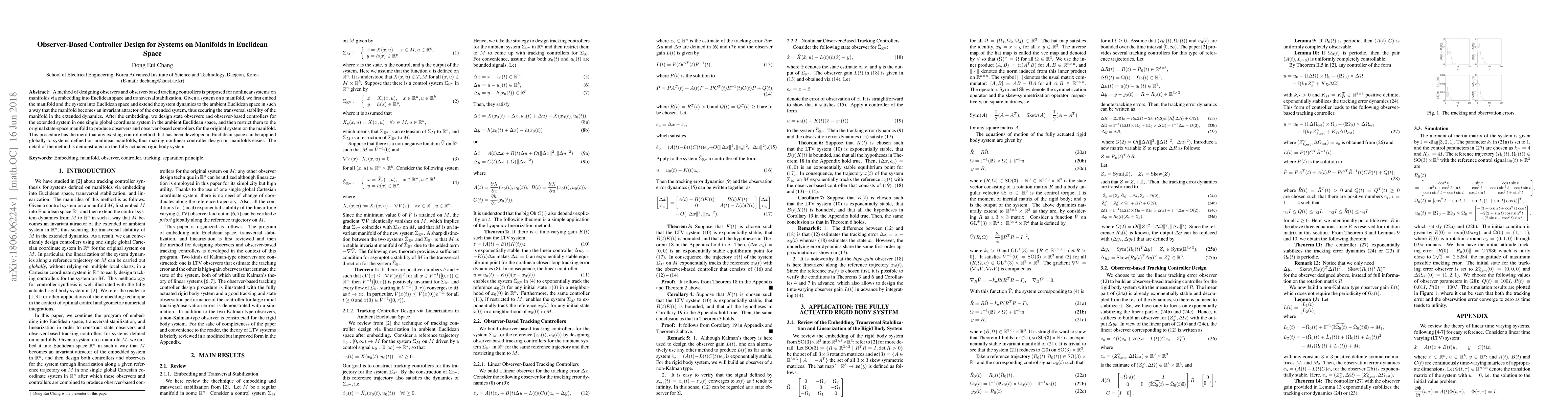 A method of designing observers and observer-based tracking controllers is proposed for nonlinear systems on manifolds via embedding into Euclidean space and transversal stabilization. Given a system on a manifold, we first embed the manifold and the system into Euclidean space and extend the system dynamics to the ambient Euclidean space in such a way that the manifold becomes an invariant attractor of the extended system, thus securing the transversal stability of the manifold in the extended dynamics. After the embedding, we design state observers and observer-based controllers for the extended system in one single global coordinate system in the ambient Euclidean space, and then restrict them to the original state-space manifold to produce observers and observer-based controllers for the original system on the manifold. This procedure has the merit that any existing control method that has been developed in Euclidean space can be applied globally to systems defined on nonlinear manifolds, thus making nonlinear controller design on manifolds easier. The detail of the method is demonstrated on the fully actuated rigid body system.