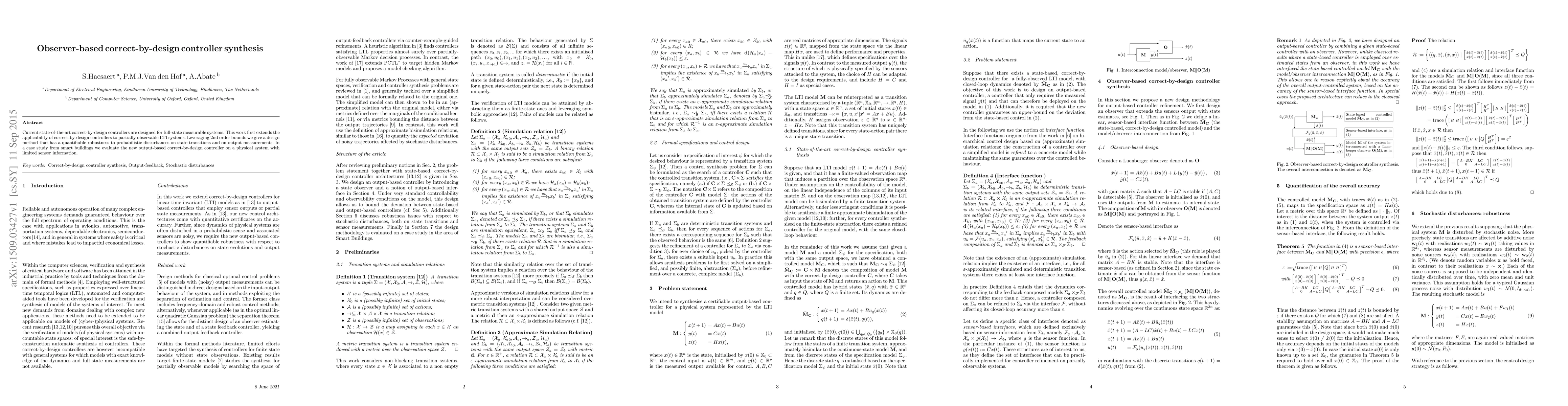 This paper extends correct-by-design controllers to partially observable linear time-invariant systems, providing a design method with quantifiable robustness against probabilistic disturbances. A case study in smart buildings demonstrates the effectiveness of the new output-based controller on a physical system with limited sensor data.