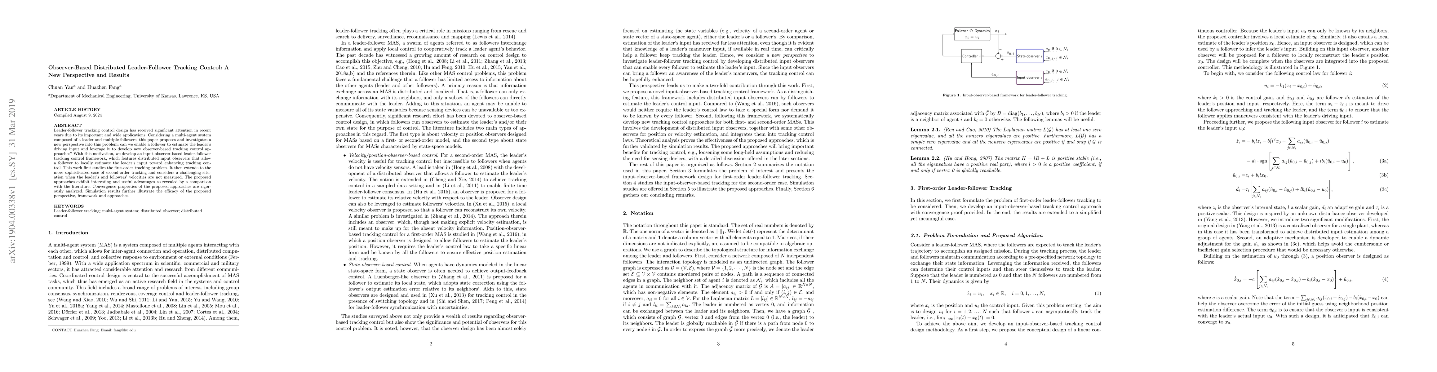 Leader-follower tracking control design has received significant attention in recent years due to its important and wide applications. Considering a multi-agent system composed of a leader and multiple followers, this paper proposes and investigates a new perspective into this problem: can we enable a follower to estimate the leader's driving input and leverage this idea to develop new observer-based tracking control approaches? With this motivation, we develop an input-observer-based leader-follower tracking control framework, which features distributed input observers that allow a follower to locally estimate the leader's input toward enhancing tracking control. This work first studies the first-order tracking problem. It then extends to the more sophisticated case of second-order tracking and considers a challenging situation when the leader's and followers' velocities are not measured. The proposed approaches exhibit interesting and useful advantages as revealed by a comparison with the literature. Convergence properties of the proposed approaches are rigorously analyzed. Simulation results further illustrate the efficacy of the proposed perspective, framework and approaches.