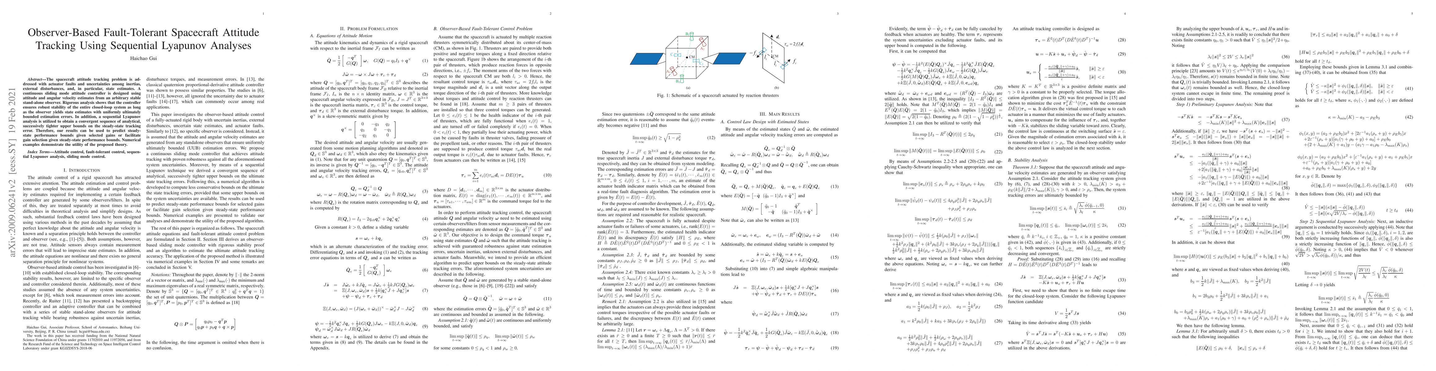 The research presents an observer-based fault-tolerant spacecraft attitude tracking system using a continuous sliding mode controller with sequential Lyapunov analyses to ensure robust stability and predict steady-state performance bounds.