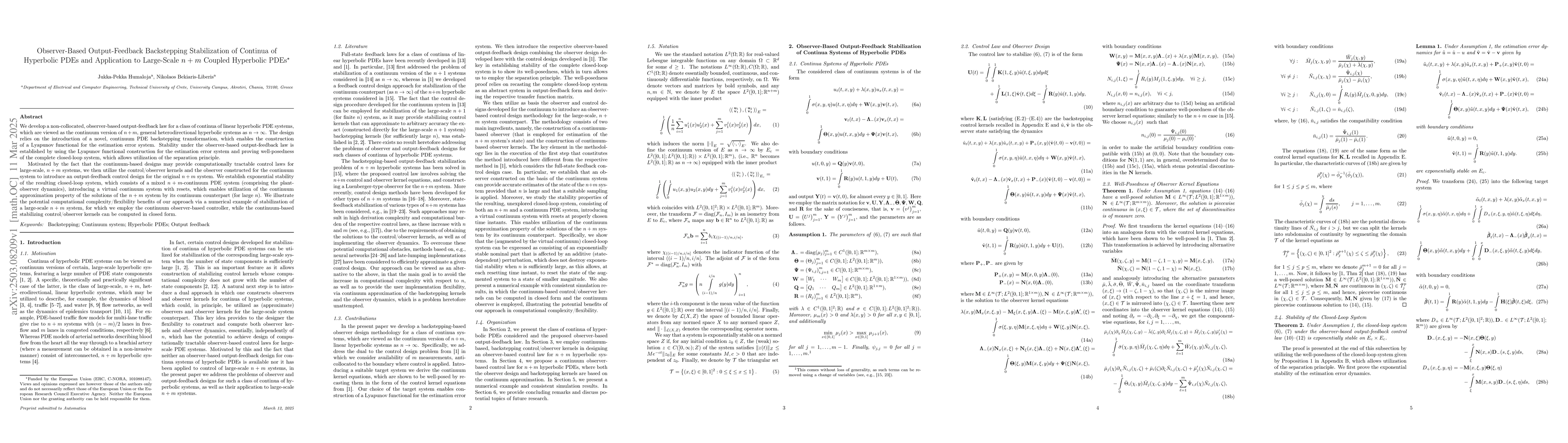 The novel continuum PDE backstepping transformation and the observer-based output-feedback law for stabilizing hyperbolic PDE continua.