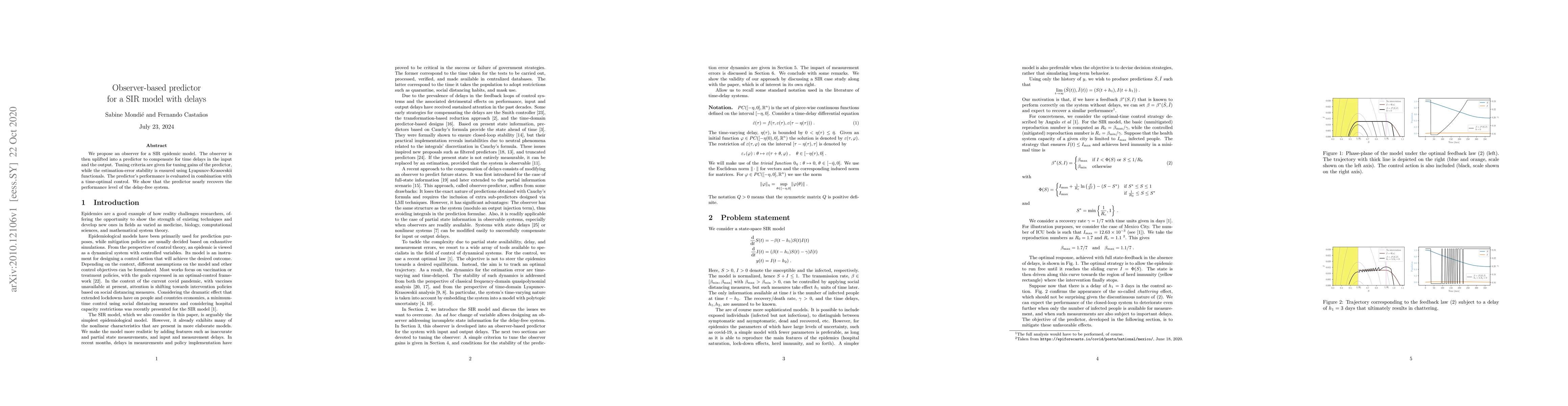 We propose an observer for a SIR epidemic model. The observer is then uplifted into a predictor to compensate for time delays in the input and the output. Tuning criteria are given for tuning gains of the predictor, while the estimation-error stability is ensured using Lyapunov-Krasovskii functionals. The predictor's performance is evaluated in combination with a time-optimal control. We show that the predictor nearly recovers the performance level of the delay-free system.