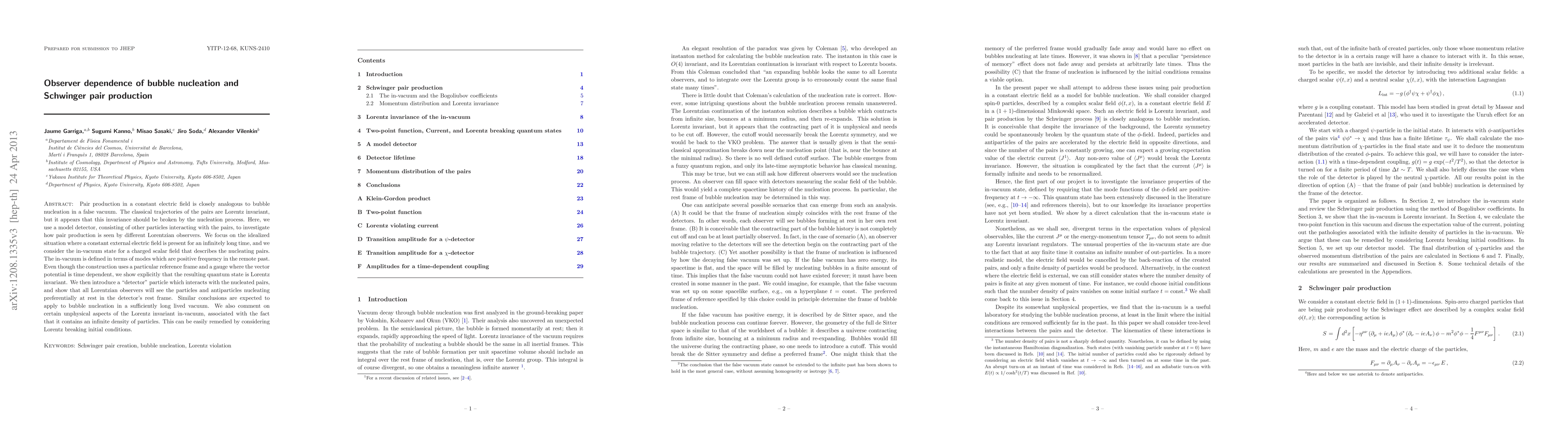 Pair production in a constant electric field is closely analogous to bubble nucleation in a false vacuum. The classical trajectories of the pairs are Lorentz invariant, but it appears that this invariance should be broken by the nucleation process. Here, we use a model detector, consisting of other particles interacting with the pairs, to investigate how pair production is seen by different Lorentzian observers. We focus on the idealized situation where a constant external electric field is present for an infinitely long time, and we consider the in-vacuum state for a charged scalar field that describes the nucleating pairs. The in-vacuum is defined in terms of modes which are positive frequency in the remote past. Even though the construction uses a particular reference frame and a gauge where the vector potential is time dependent, we show explicitly that the resulting quantum state is Lorentz invariant. We then introduce a "detector" particle which interacts with the nucleated pairs, and show that all Lorentzian observers will see the particles and antiparticles nucleating preferentially at rest in the detector's rest frame. Similar conclusions are expected to apply to bubble nucleation in a sufficiently long lived vacuum. We also comment on certain unphysical aspects of the Lorentz invariant in-vacuum, associated with the fact that it contains an infinite density of particles. This can be easily remedied by considering Lorentz breaking initial conditions.