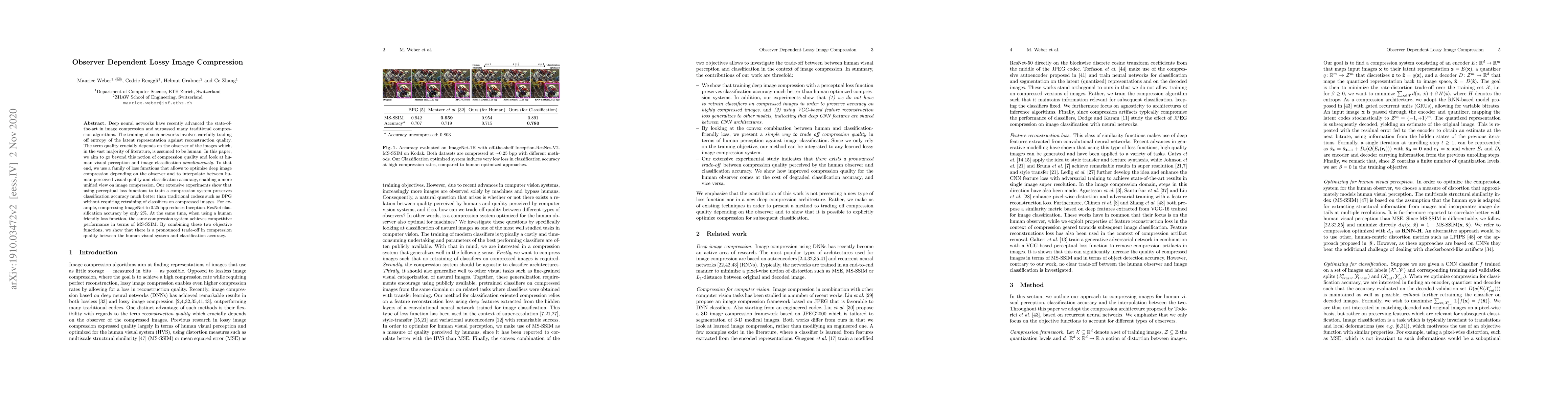 Deep neural networks have recently advanced the state-of-the-art in image compression and surpassed many traditional compression algorithms. The training of such networks involves carefully trading off entropy of the latent representation against reconstruction quality. The term quality crucially depends on the observer of the images which, in the vast majority of literature, is assumed to be human. In this paper, we aim to go beyond this notion of compression quality and look at human visual perception and image classification simultaneously. To that end, we use a family of loss functions that allows to optimize deep image compression depending on the observer and to interpolate between human perceived visual quality and classification accuracy, enabling a more unified view on image compression. Our extensive experiments show that using perceptual loss functions to train a compression system preserves classification accuracy much better than traditional codecs such as BPG without requiring retraining of classifiers on compressed images. For example, compressing ImageNet to 0.25 bpp reduces Inception-ResNet classification accuracy by only 2%. At the same time, when using a human friendly loss function, the same compression system achieves competitive performance in terms of MS-SSIM. By combining these two objective functions, we show that there is a pronounced trade-off in compression quality between the human visual system and classification accuracy.