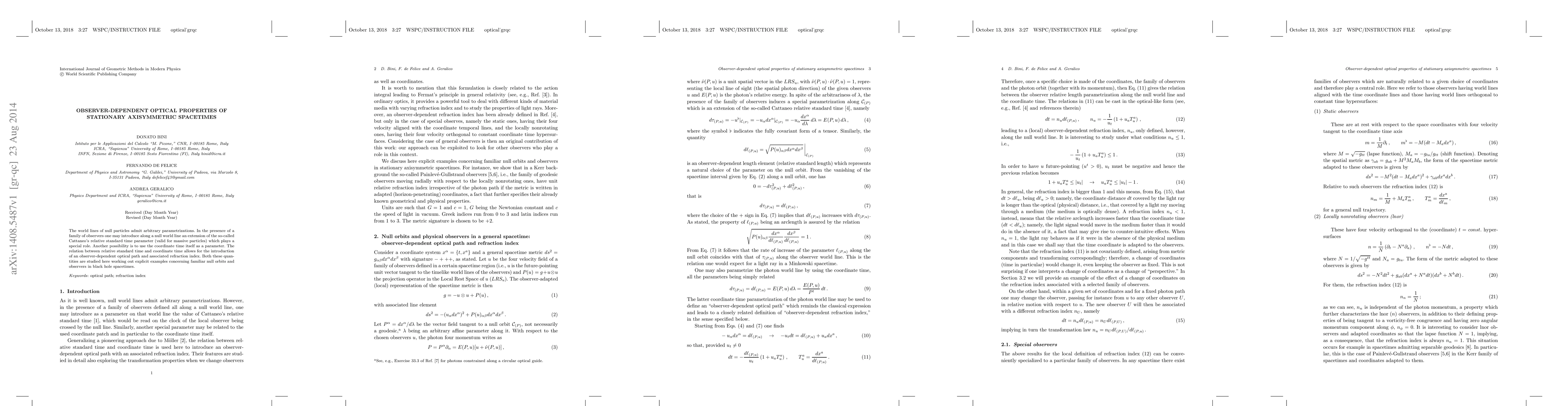 The world lines of null particles admit arbitrary parametrizations. In the presence of a family of observers one may introduce along a null world line an extension of the so-called Cattaneo's relative standard time parameter (valid for massive particles) which plays a special role. Another possibility is to use the coordinate time itself as a parameter. The relation between relative standard time and coordinate time allows for the introduction of an observer-dependent optical path and associated refraction index. Both these quantities are studied here working out explicit examples concerning familiar null orbits and observers in black hole spacetimes.