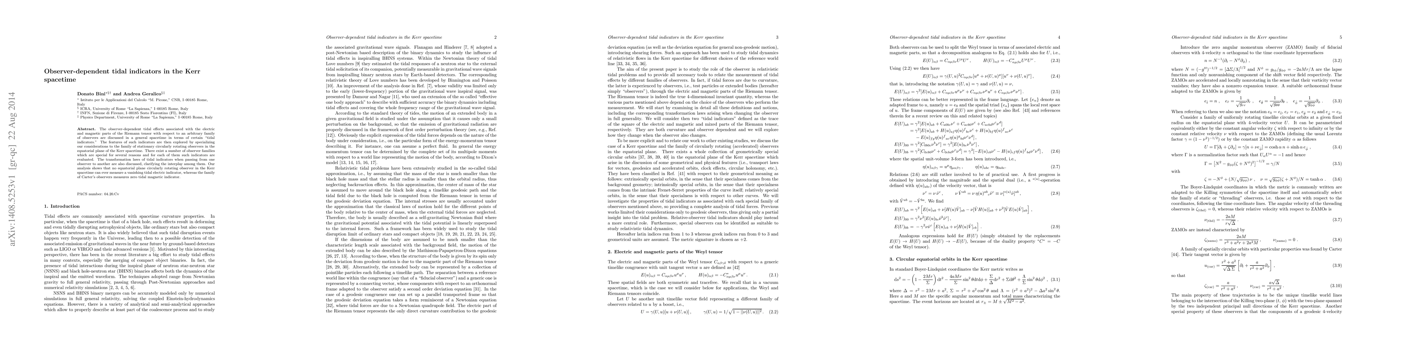 This paper investigates observer-dependent tidal indicators in the Kerr spacetime, focusing on how different observers measure tidal effects. The study reveals that no equatorial circularly rotating observer can detect a vanishing tidal electric indicator, while Carter's observers measure zero tidal magnetic indicator.