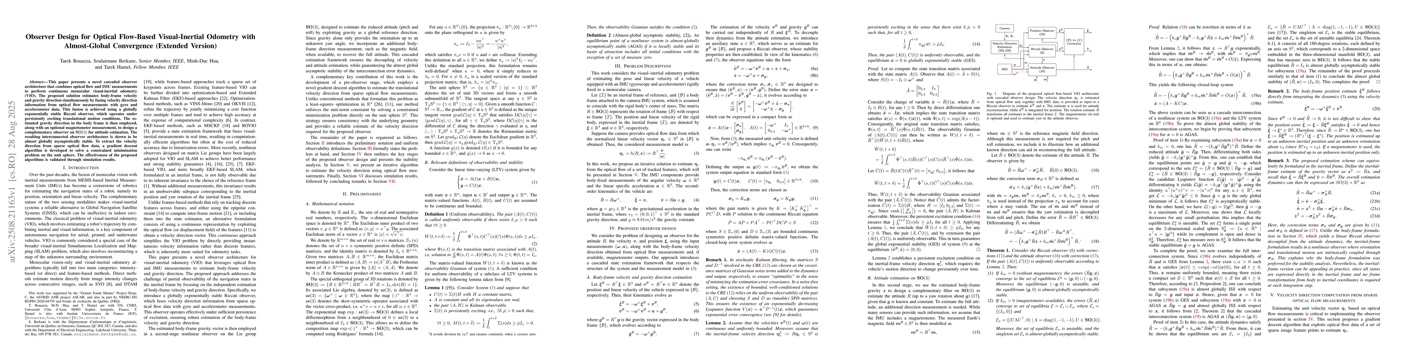 This paper presents a novel cascaded observer architecture that combines optical flow and IMU measurements to perform continuous monocular visual-inertial odometry (VIO). The proposed solution estimates body-frame velocity and gravity direction simultaneously by fusing velocity direction information from optical flow measurements with gyro and accelerometer data. This fusion is achieved using a globally exponentially stable Riccati observer, which operates under persistently exciting translational motion conditions. The estimated gravity direction in the body frame is then employed, along with an optional magnetometer measurement, to design a complementary observer on $\mathbf{SO}(3)$ for attitude estimation. The resulting interconnected observer architecture is shown to be almost globally asymptotically stable. To extract the velocity direction from sparse optical flow data, a gradient descent algorithm is developed to solve a constrained minimization problem on the unit sphere. The effectiveness of the proposed algorithms is validated through simulation results.