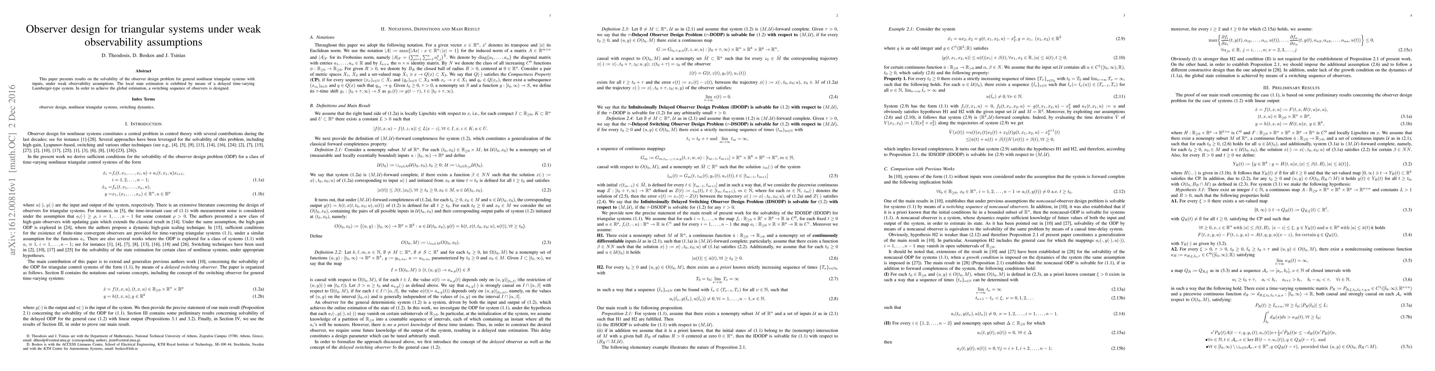 This paper presents a solution for designing observers for nonlinear triangular systems under weak observability assumptions, utilizing a delayed Luenberger-type observer for local state estimation and a switching sequence of observers for global estimation.