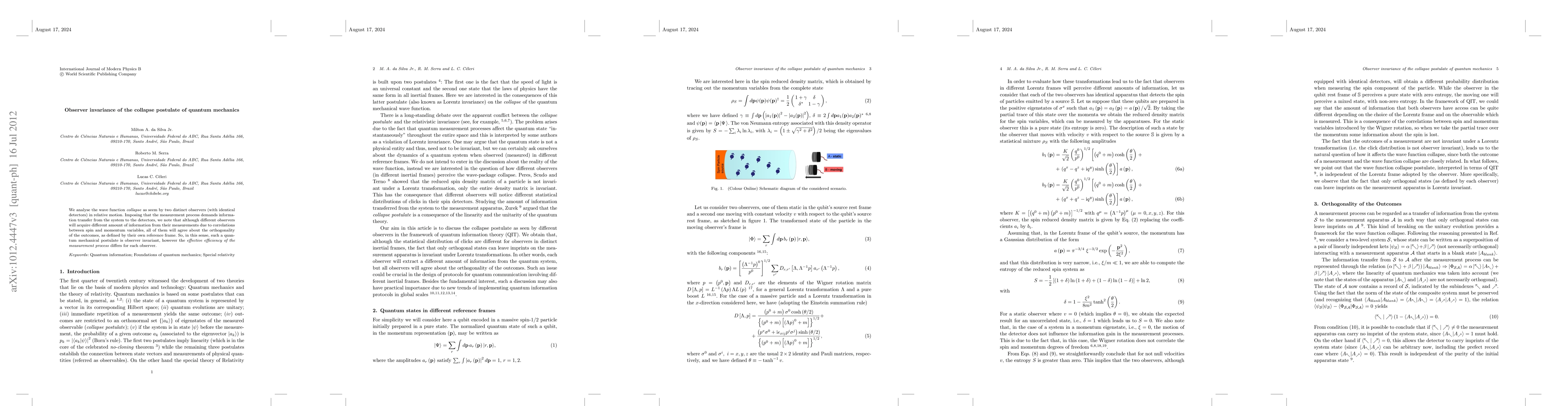This paper examines the wave function collapse from the perspectives of two observers in relative motion, finding that while they acquire different information due to spin-momentum correlations, they all agree on the orthogonality of outcomes within their respective frames, demonstrating observer invariance of the collapse postulate. However, the measurement efficiency varies for each observer.