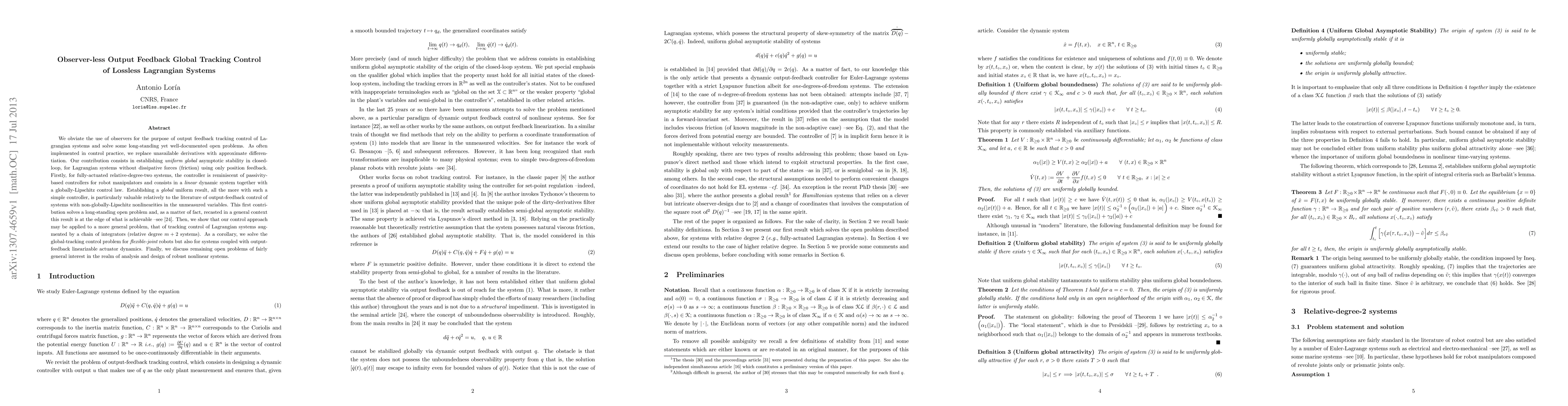 This paper presents an observer-less output feedback control strategy for lossless Lagrangian systems, achieving global tracking without requiring observers. It establishes uniform global asymptotic stability using only position feedback, solving long-standing issues in the control of systems with non-globally-Lipschitz nonlinearities.