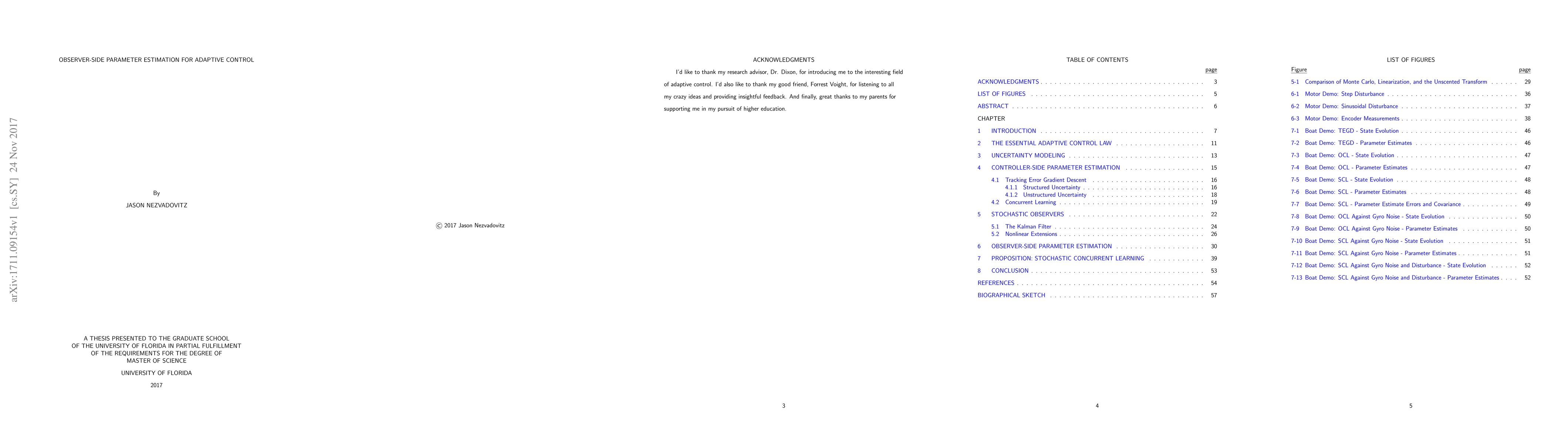 This paper explores observer-side parameter estimation for adaptive control, aiming to integrate probabilistic information from state observers into adaptive update mechanisms. It proposes a new technique to enhance the robustness of observer-based adaptive control, addressing the lack of established closed-loop stability proofs.