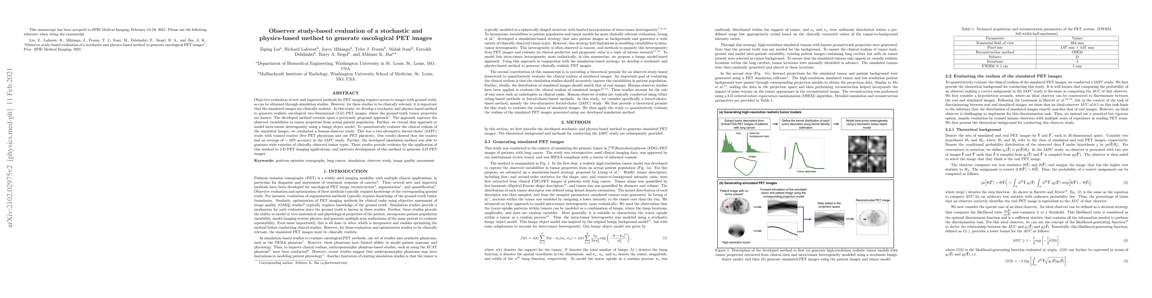 This study developed a stochastic and physics-based method to generate realistic oncological 2-D PET images with known ground-truth tumor properties, incorporating intra-tumor heterogeneity. A human-observer study showed that trained readers had ~50% accuracy, indicating the clinical relevance of the simulated images.
